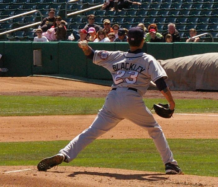 2009년, 애리조나 다이아몬드백스의 트리플 A 제휴팀인 리노 에이스에서 주자를 견제하기 위해 1루로 던지는 블래클리.