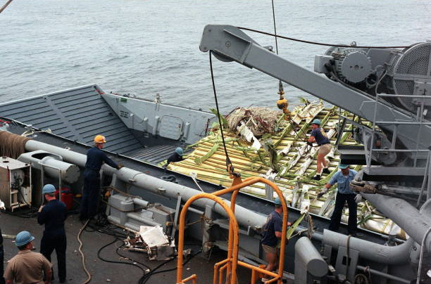바다에서 수거된 잔해 위치(적색, 황색, 녹색 구역)는 다음을 명확하게 보여준다.[51]