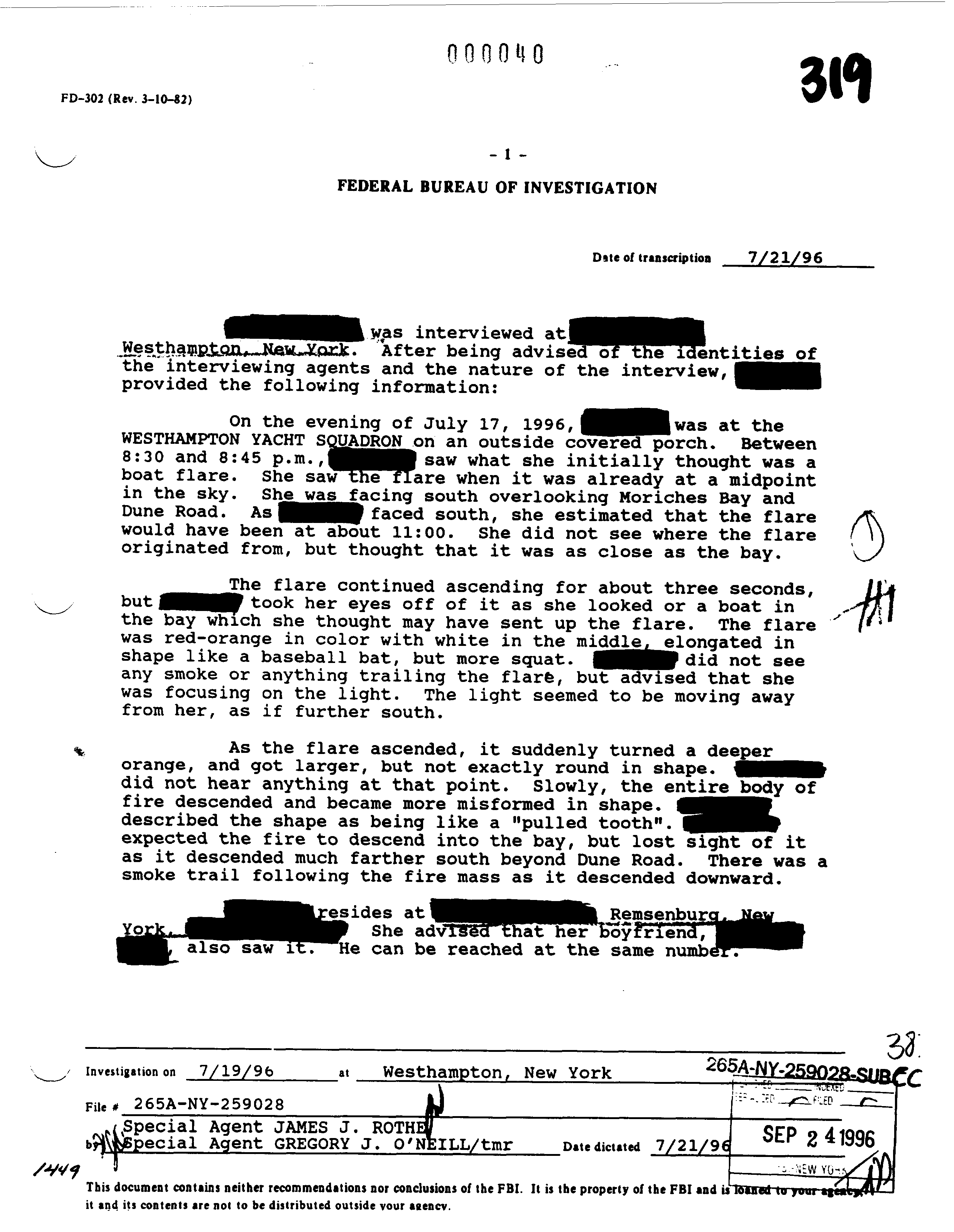 NTSB는 사고 초기 목격자 인터뷰 계획을 발표했으나, FBI의 우려로 인해 연기되었다.[45] 이후 NTSB는 FBI의 목격자 진술 요약본을 검토하고 일부 목격자를 인터뷰했지만,[45] FBI와의 협력 문제, 시간 경과 등의 이유로 재인터뷰는 제한적으로 이루어졌다.[2]
