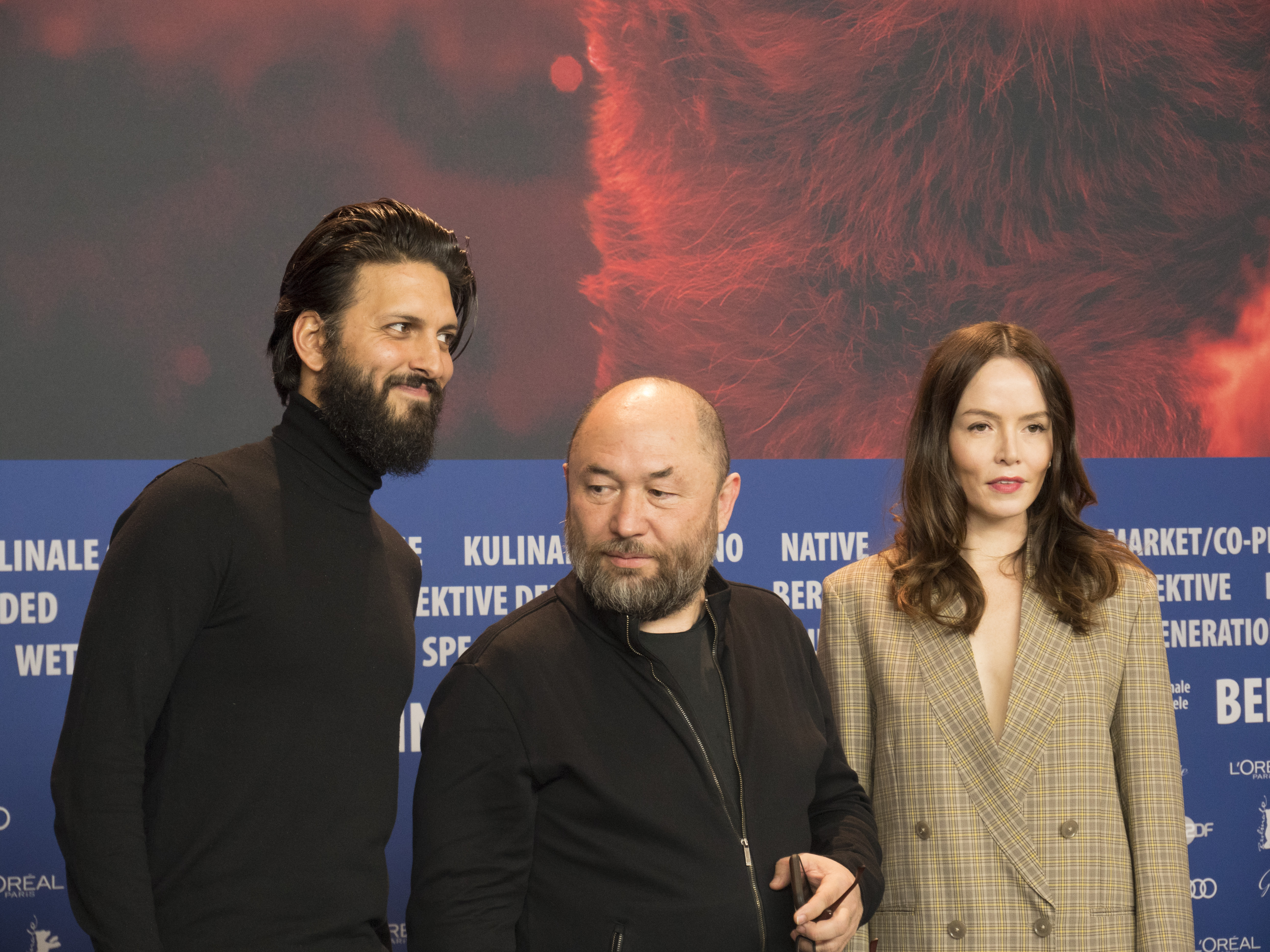 2018년 베를린 영화제에서 열린 ''프로파일'' 기자 회견. 샤자드 라티프, 티무르 베크맘베토프, 발렌 카인.