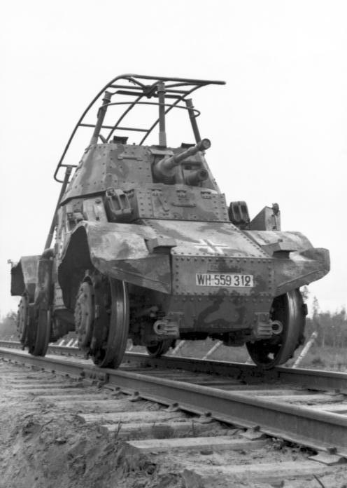 독일군 개조 차량: 1941년 이후 독일군은 43대의 차량을 철도 경비 차량(''Schienenpanzer'')으로 개조했다.[17] 이들은 특수 바퀴를 사용하여 철로 위를 주행할 수 있었으며, 대형 무선 프레임 안테나를 장착했다.