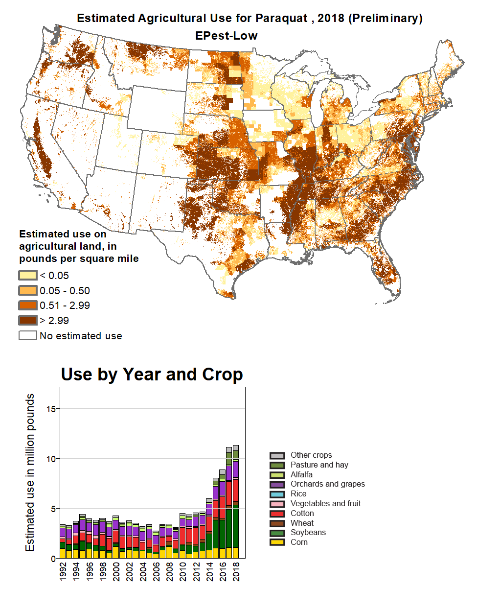 미국에서는 제한된 사용 농약으로 분류되어 면허를 받은 시공자만 사용할 수 있다. 2021년 10월 추정에 따르면, 미국 내 파라콰트 사용량은 2013년부터 2018년까지 두 배로 증가하여 연간 4,535,924kg에 달했다.[20]