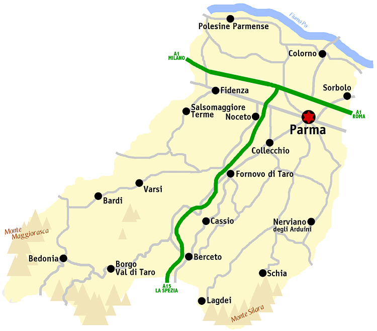 2001년 인구 조사에 따르면, 인구 5,000명 이상의 도시는 파르마, 피덴차, 살소마조레 테르메, 콜레키오, 노체토, 소르볼로, 콜로르노, 란기라노, 보르고 발 디 타로 등이 있다.[9]