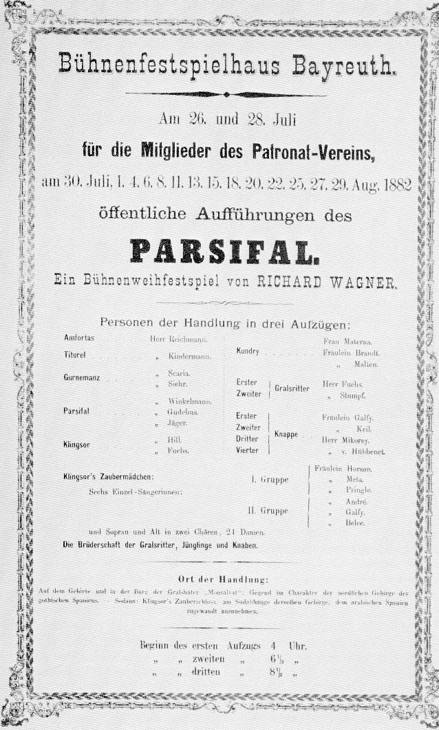 1880년 11월 12일, 바그너는 그의 후원자인 루트비히 2세를 위해 뮌헨의 궁정극장에서 전주곡을 비공개로 연주했다.[11] 1882년 7월 26일, 헤르만 레비의 지휘 아래 바이로이트 페스트슈필하우스에서 전곡 초연이 이루어졌다. 무대 디자인은 막스 브뤼크너와 파울 폰 유코프스키가 맡았으며, 바그너에게서 영감을 받았다. 성배의 홀은 바그너가 1880년에 방문했던 시에나 대성당 내부를, 클링조어의 마법 정원은 라벨로에 있는 팔라초 루폴로의 정원을 모델로 했다.[12] 1882년 7월과 8월, 레비와 프란츠 피셔의 지휘 아래 바이로이트에서 16회 공연되었으며, 오케스트라 단원 107명, 합창단원 135명, 독창자 23명이 참여했다(주요 배역은 더블 캐스팅).[13] 마지막 공연에서 바그너는 레비에게서 지휘봉을 이어받아 3막의 마지막 장면을 오케스트라 간주곡부터 끝까지 지휘했다.[14]