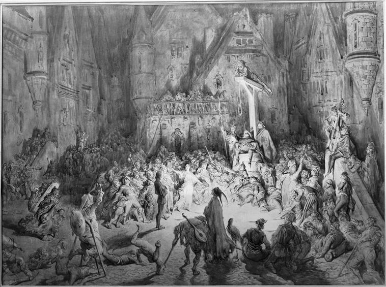 하지만 프롤로는 에스메랄다를 차지하려는 욕망을 버리지 못하고 계략을 꾸민다. 그는 그랭구아르를 부추겨 기적의 궁정 사람들에게 파리 의회가 에스메랄다의 성역권을 박탈하기로 했으니, 성당을 공격하여 그녀를 구출해야 한다고 믿게 만든다. 집시와 부랑자들이 성당을 공격하자, 콰지모도는 이들이 에스메랄다를 해치려는 것으로 오해하고 필사적으로 맞서 싸운다.