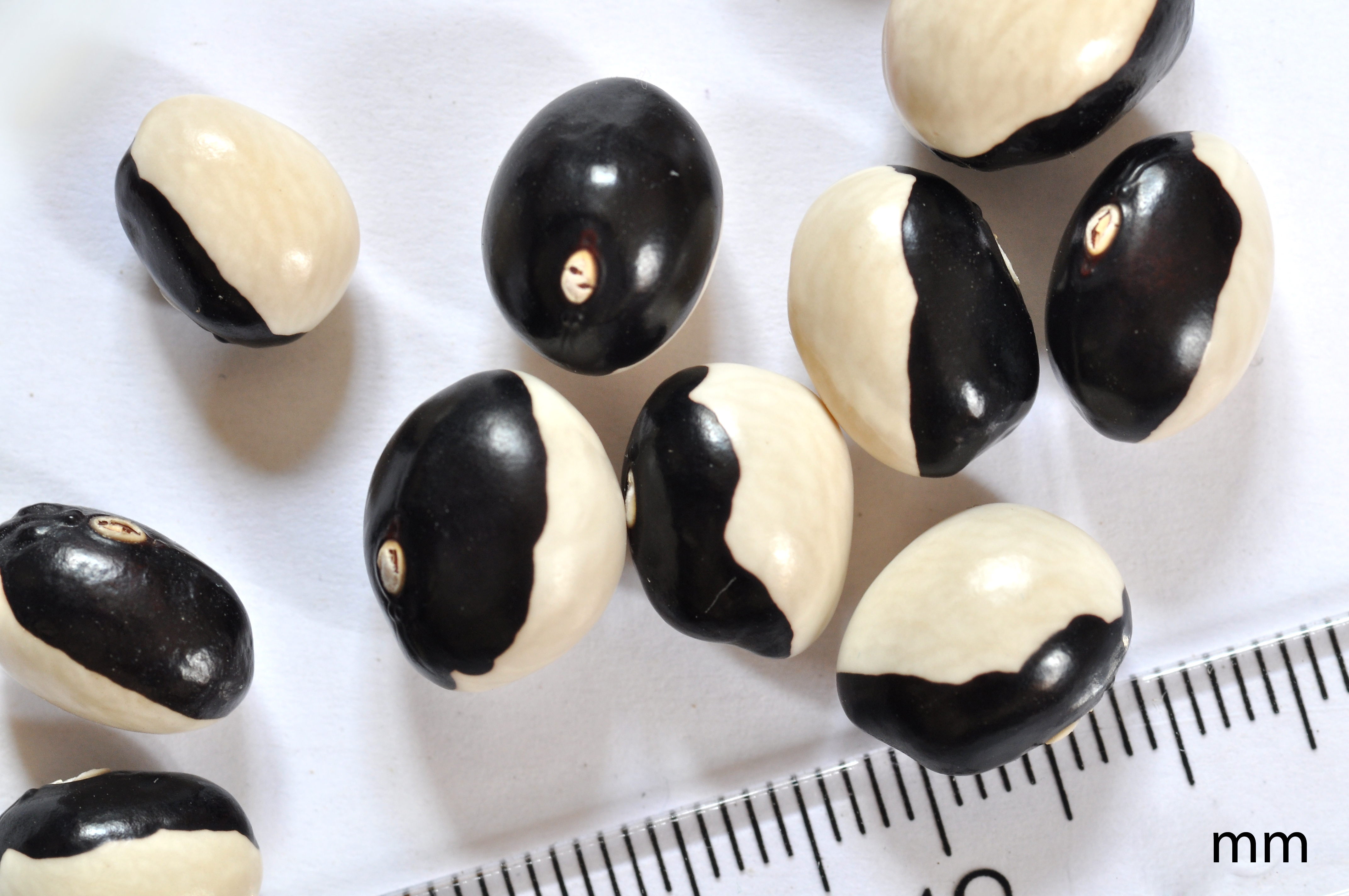 판다 콩 또는 음양 콩이라고도 하며, 흰색과 검은색이 반반이며 흰색 부분에 검은 점이 하나 또는 두 개 있다.