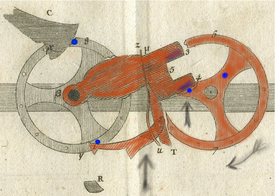 ''machine tardive''[9]를 제외한 모든 기계의 휠에는 두 개의 인접한 바퀴살이 표시되어 있었으며, 이는 기계마다 달랐다.[10][11] 이 표시는 실린더를 최대 숫자로 설정하여 다시 0으로 만들 준비를 하는 데 사용되었다. 알려진 기계 중 4대에는 빼기를 할 때 첫 번째 피연산자를 입력하는 데 사용된 내부 보수 휠이 있었고,[12] 다른 4대에는 각 휠 위에 작은 몫 휠이 장착되어 나눗셈에서 제수가 빼진 횟수를 기억하는 데 사용되었다.[13]