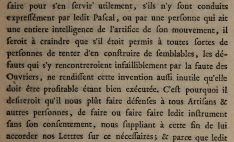 블레즈 파스칼은 1642년, 18세에 계산기 연구를 시작했다.[7] 당시 세무 위원으로 일하던 아버지의 업무를 돕기 위해 세금 계산을 자동화할 수 있는 장치를 고안하고자 했다.[7] 파스칼은 1649년에 왕실 특권을 받아 프랑스에서 계산기를 제조하고 판매할 독점권을 얻었다.