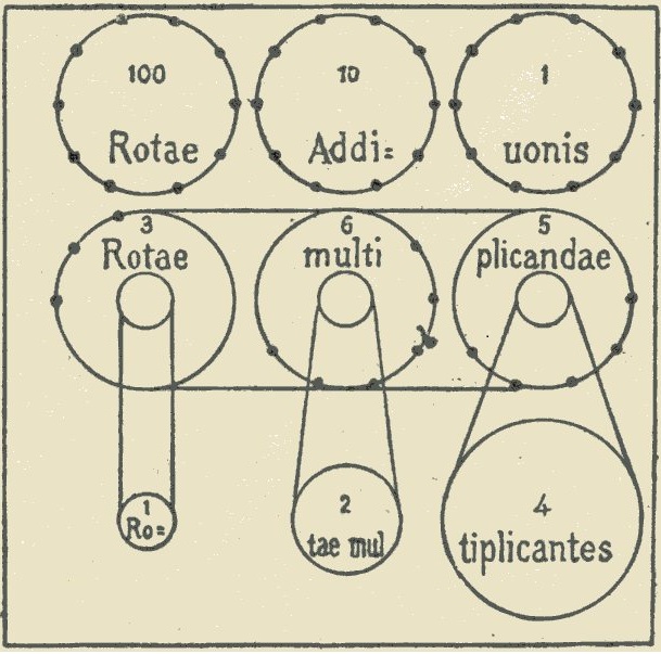 | 가장 오른쪽에 있는 휠에 1을 더한다. 각 휠은 자신의 사토어를 다음 휠로 보낸다. 0이 오른쪽에서 왼쪽으로 도미노 효과처럼 차례로 나타난다.
