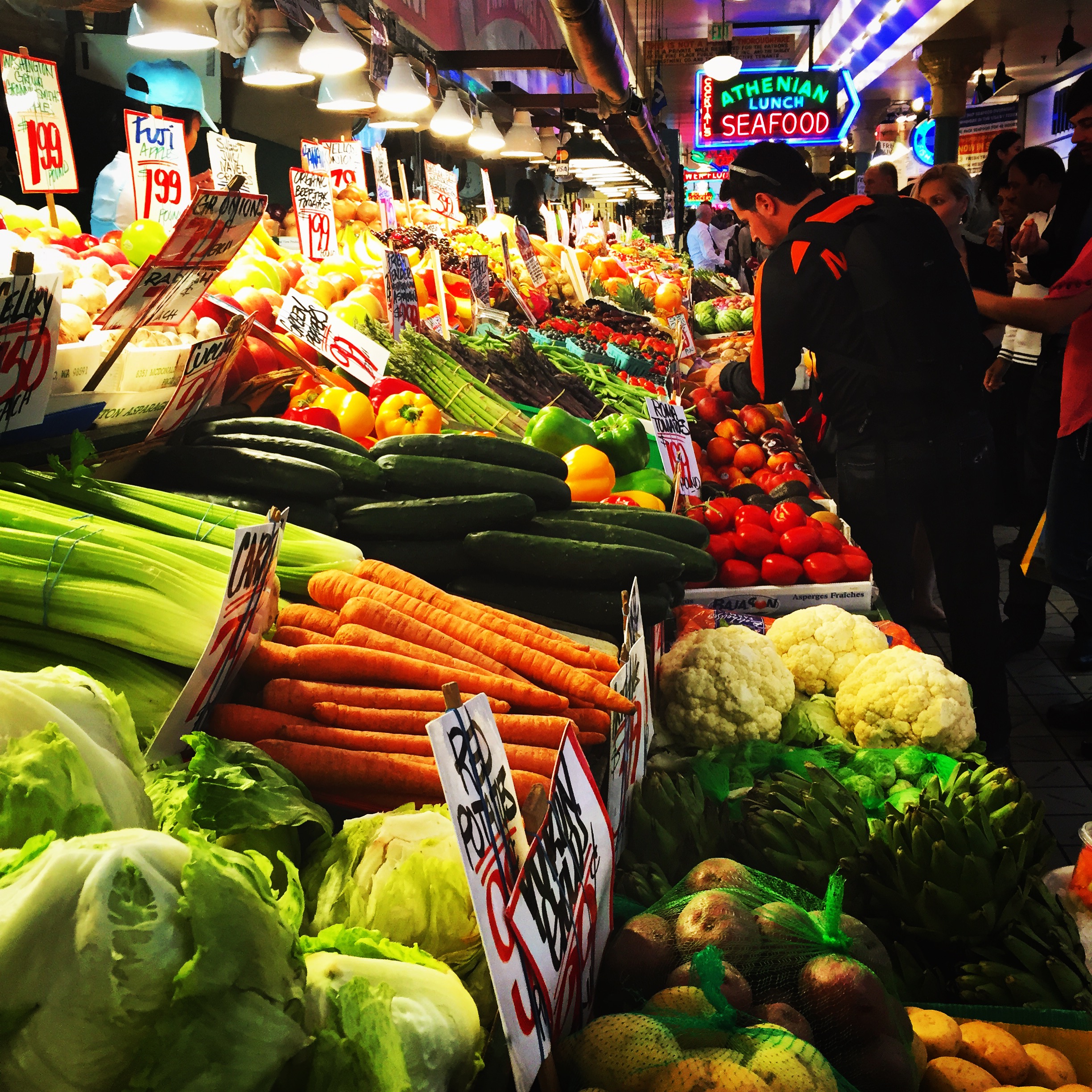 파이크 플레이스 피시 마켓(Pike Place Fish Market)에서는 직원들이 90cm 길이의 연어와 다른 생선을 서로 던져 주고받는 광경을 볼 수 있다. 고객이 생선을 주문하면, 얼음 진열대에 있는 직원이 생선을 계산대 너머로 던지고, 다른 직원이 받아 판매를 준비한다.[71]