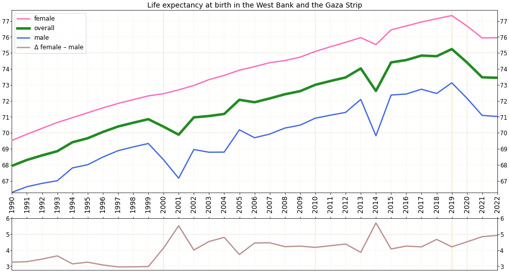 인구 성장률 | 가자 지구: 2.02% (2022년 추정) 요르단 강 서안 지구: 1.69% (2022년 추정) |
