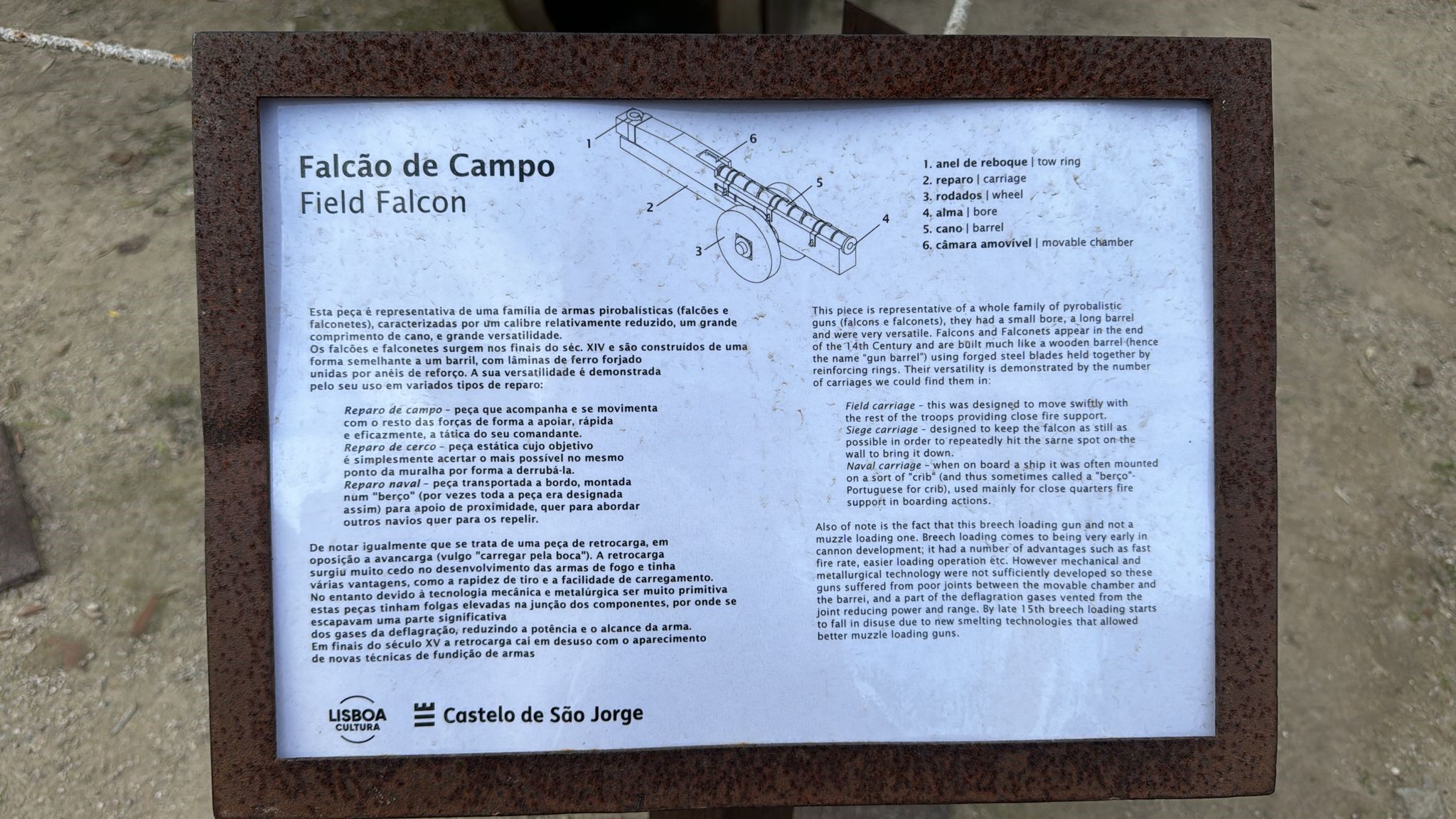 리스본의 상 조르제 성에는 14세기 후장식 야전 팔코네트가 전시되어 있다. 이 팔코네트는 화약식 포의 초기 형태를 대표하는 유물로, 구경이 작고 포신이 길며 다양한 용도로 사용되었다.[1]
