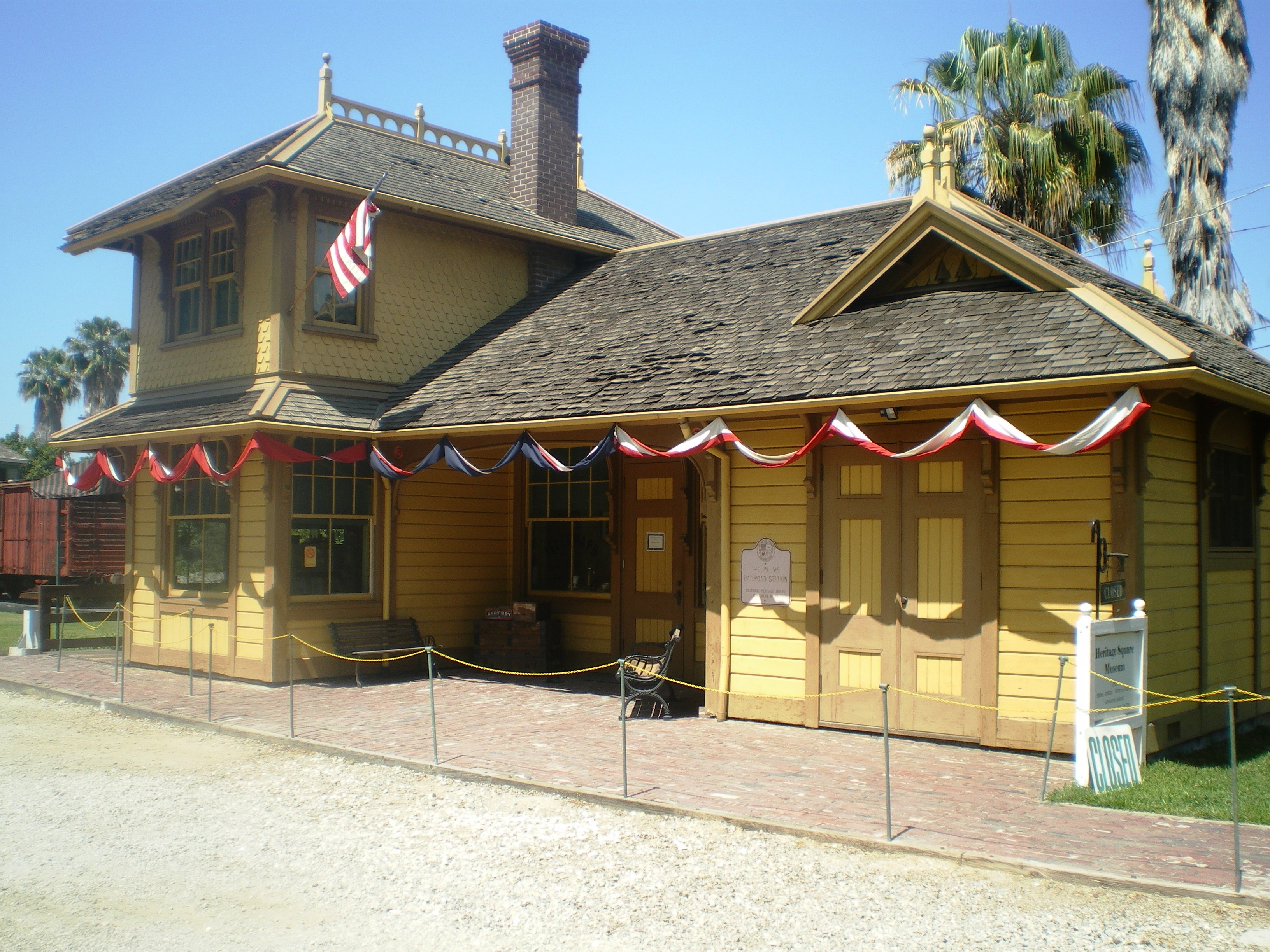 이스트레이크 스타일의 팜스-서던 퍼시픽 철도역 건물은 1953년 산타 모니카 항공 노선이 폐쇄될 때까지 철도 서비스를 제공했다.[5] 1963년 로스앤젤레스 역사 문화 기념물로 지정되었고, 1976년 헤리티지 스퀘어 박물관으로 옮겨져 현재 기념품점 겸 방문자 센터로 사용되고 있다.[5]