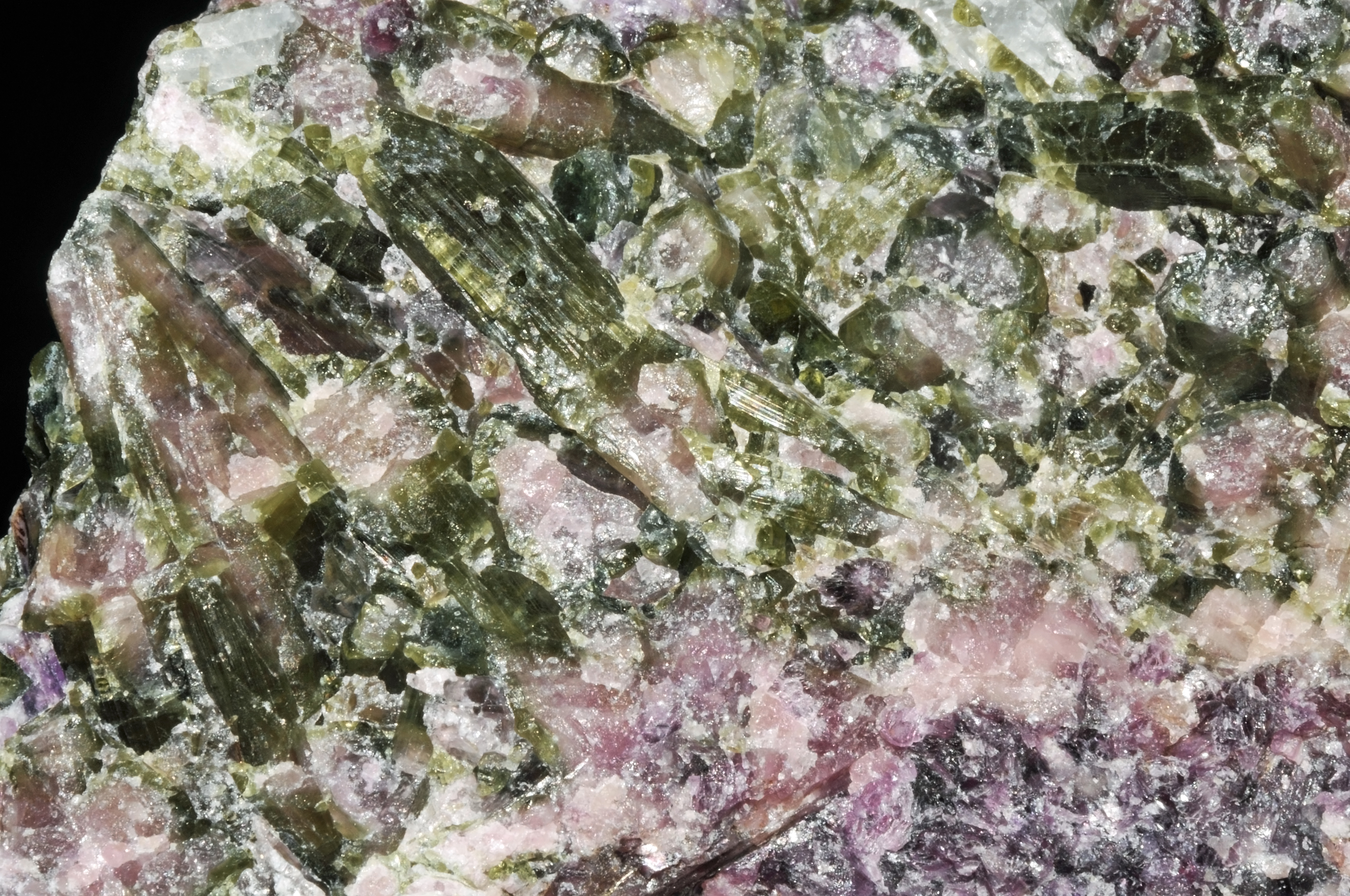 일부 페그마타이트는 더 복잡한 구역을 갖는다. 미국 뉴멕시코 북부 피쿠리스 산맥의 하딩 페그마타이트에서는 다음과 같은 다섯 개의 뚜렷한 구역이 인식된다.[17]구역 설명 세립질 석영-백운모 페그마타이트 백운모 페그마타이트의 흰색 가장자리 껍질 매우 조립질 석영, 백운모 및 백운모의 연속 층 미사장석, 인회석, 녹주석, 탄탈석 포함 대량의 석영의 연속 층 백운모, 미사장석, 클리블랜드석 풍부 웅장한 석영 및 판상 스포듀민 구역 칼날 모양의 스포듀민 결정, 부속 광물로 녹주석, 인회석, 미사장석, 탄탈-니오브 광물 "반점암" 상대적으로 세립질 스포듀민, 미사장석, 석영, 세립질 백운모, 리튬 함유 백운모, 레피도라이트, 미크롤라이트, 탄탈석