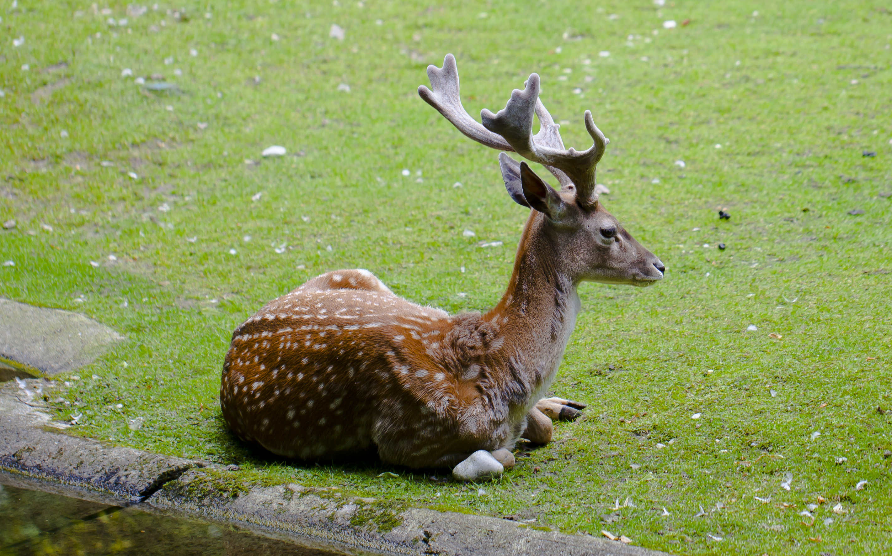 풀밭에 누워있는 페르시아 다마사슴 수컷