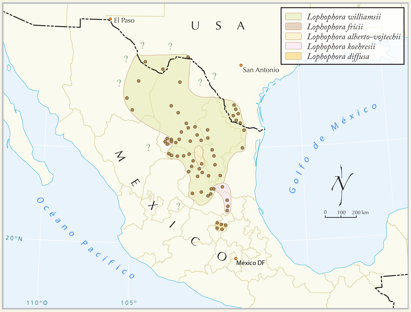 페요테(''L. williamsii'')는 주로 멕시코에 분포하는 북아메리카 남부가 원산지이다.[9][10][11] 미국에서는 텍사스 남부에서 자생한다. 멕시코에서는 북부의 치와와 주, 코아우일라 주, 누에보레온 주, 타마울리파스 주에서부터 산루이스포토시 주와 사카테카스 주까지 자란다. 주로 해발 100~1,500m 고도에서 발견되며, 치와와 사막에서는 예외적으로 1,900m까지 자생한다. 타마울리파스의 온화한 기후에서도 발견된다. 서식지는 주로 사막 관목 지대, 특히 타마울리파스의 타마울리판 메스키탈 가시 관목 지대이며, 석회암 언덕 근처에서 흔히 발견된다.[12]