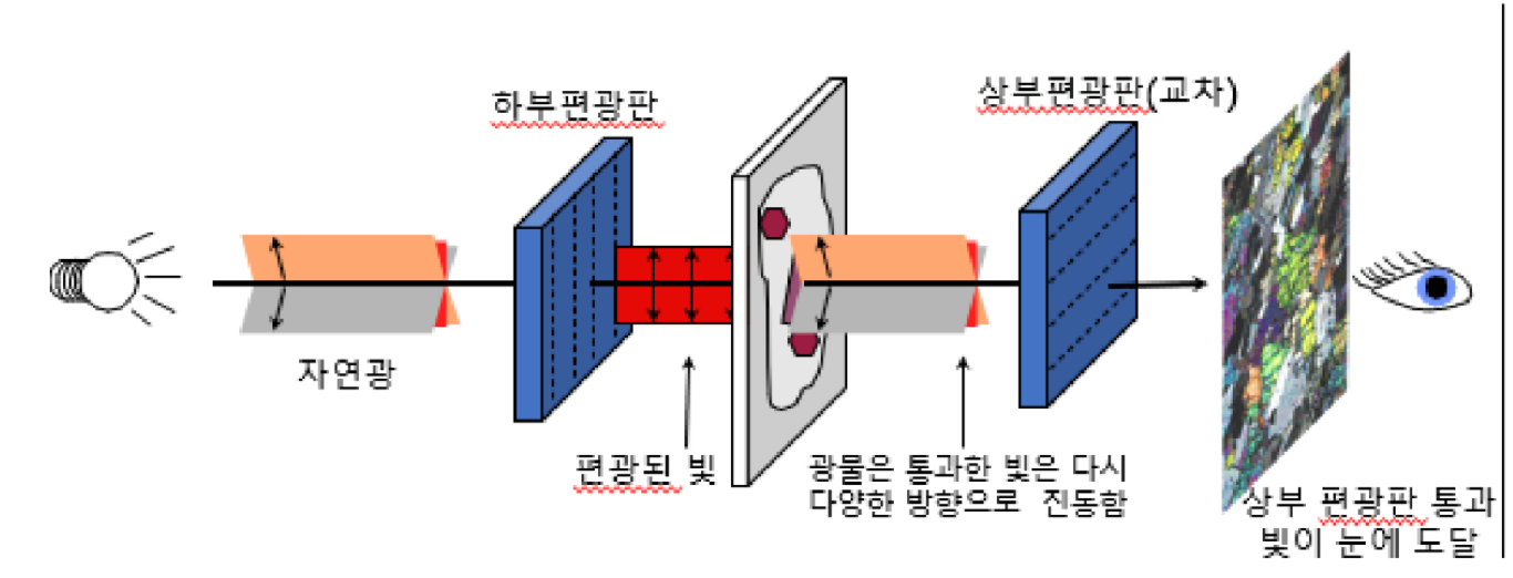 간섭 | 편광된 빛이 샘플을 통과하면서 복굴절, 다색성, 광축 방향 등의 광학적 특성에 따라 빛의 편광 상태가 변화 변화된 빛은 다른 편광판을 통과하면서 간섭을 일으키고, 이를 통해 샘플의 광학적 특성을 시각적으로 분석 |