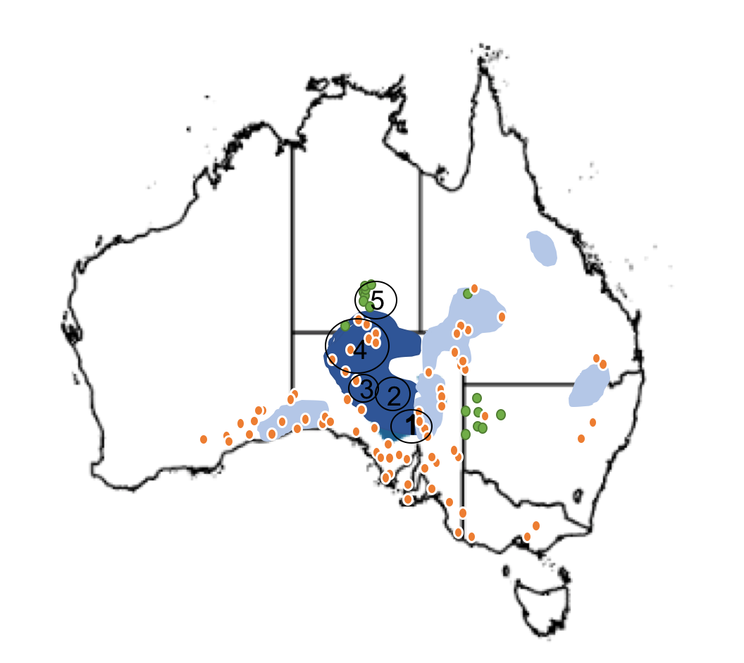 평원쥐의 주요 현존 개체군은 다섯 개의 광범위한 지리적 구역으로 나눌 수 있다:[5] 1) 아르쿠나 테이블랜드, SA; 2) 사우스 에어 호 지역, SA; 3) 문 플레인 지역, SA; 4) 우드나다타 지역 (위트지라 국립공원 포함), SA/NT; 그리고 5) 안다도 스테이션 및 맥 클라크 보존 구역, NT (