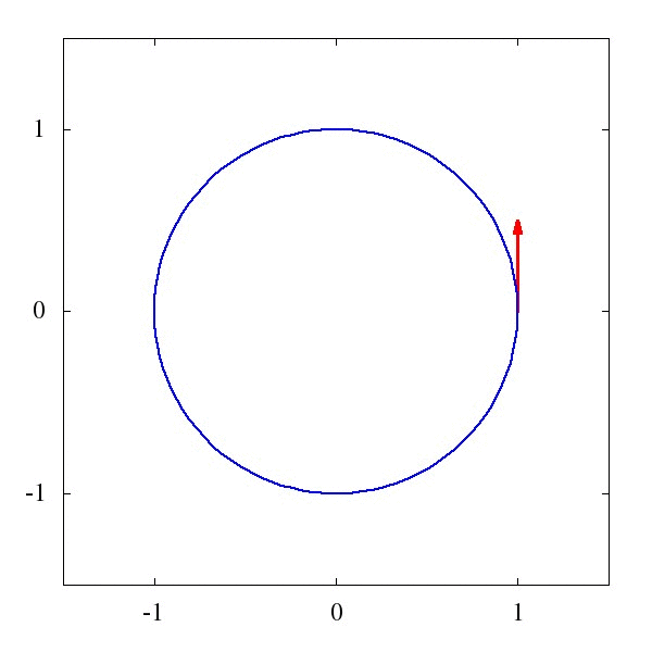 첫 번째 계량은 곡률이 0이므로, 원을 따라 두 점 사이를 이동할 때 다른 곡선을 이용할 수도 있다. 그러나 두 번째 계량은 0이 아닌 곡률을 가지며, 원은 측지선이므로 접선 벡터는 평행하다.