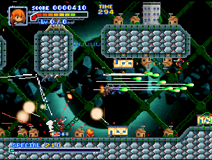 젝토르는 도시를 구하기 위해 로봇 군주를 파괴하는 게임으로, 플레이어는 로보프로브와 무빙 모보이드의 공격을 막아내고 회전 방벽 뒤의 로봇 머리를 파괴하여 도시를 구출하고 우주선을 얻으며, 여덟 번째 도시에서 과정이 반복되고 플레이스테이션 2 버전 세가 제네시스 컬렉션에 포함되었다. - 트레저 게임 - 레이디언트 실버건