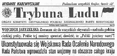 1981년 10월, 카냐는 사임을 강요당했고, 총리였던 보이치에흐 야루젤스키가 당 제1서기를 겸임하게 되었다.[96] 독립자주관리노동조합 "연대" 의장 바웬사와 야루젤스키 총리 등 정부 고위 관계자들 간에 협의가 이루어졌고, 연대와 정부 간에 협정이 체결되었다.[96] 그러나 야루젤스키는 1981년 12월 13일 전국에 계엄령을 선포하고, 바웬사 등 연대 활동가들과 구정권 지도자들을 구금했다.[96]