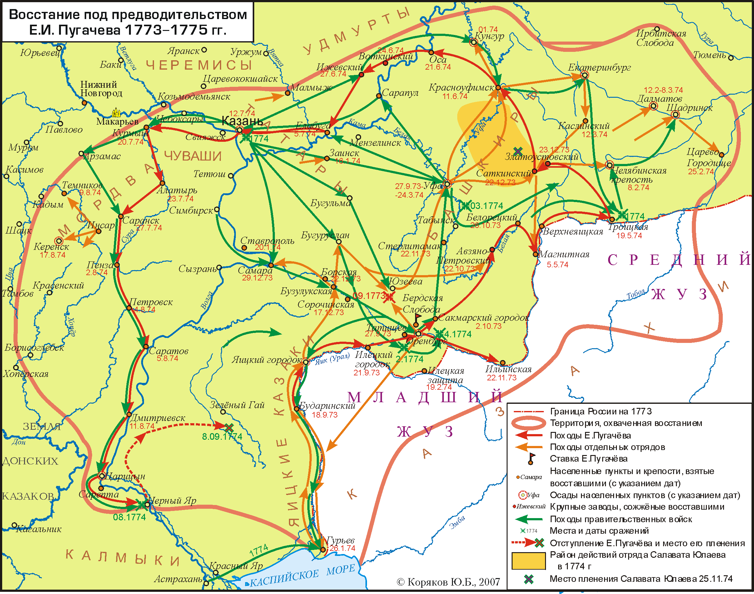 1773년 푸가초프의 군대는 사마라를 공격하여 점령했다. 카잔 함락은 그의 가장 큰 승리였다.[5] 그러나, 예카테리나 2세는 초기에는 코사크를 농담으로 여기며 500루블의 현상금을 걸었으나, 1774년 11월에는 2만 8천 루블 이상으로 현상금을 올렸다.[5] 러시아 장군 미헬손은 군대의 수송 부족과 훈련 부족으로 어려움을 겪었지만, 푸가초프는 몇몇 중요한 승리를 거두었다.[5]1773년 9월 푸가초프가 반란을 일으킨 후, 10월 초에는 오렌부르크 지역의 수도로 진격했다. 이 요새를 포위하는 동안 반군은 정부의 구원대를 격파하고 반란을 북쪽 우랄, 서쪽 볼가 강, 동쪽 시베리아로 확산시켰다.[5] 오렌부르크 포위전은 페트르 미하일로비치 톨리친 공이 이끄는 정부군에 의해 1774년 3월 타티셰보 전투와 4월 삭마르스크 전투에서 푸가초프군이 대패하며 끝났다.