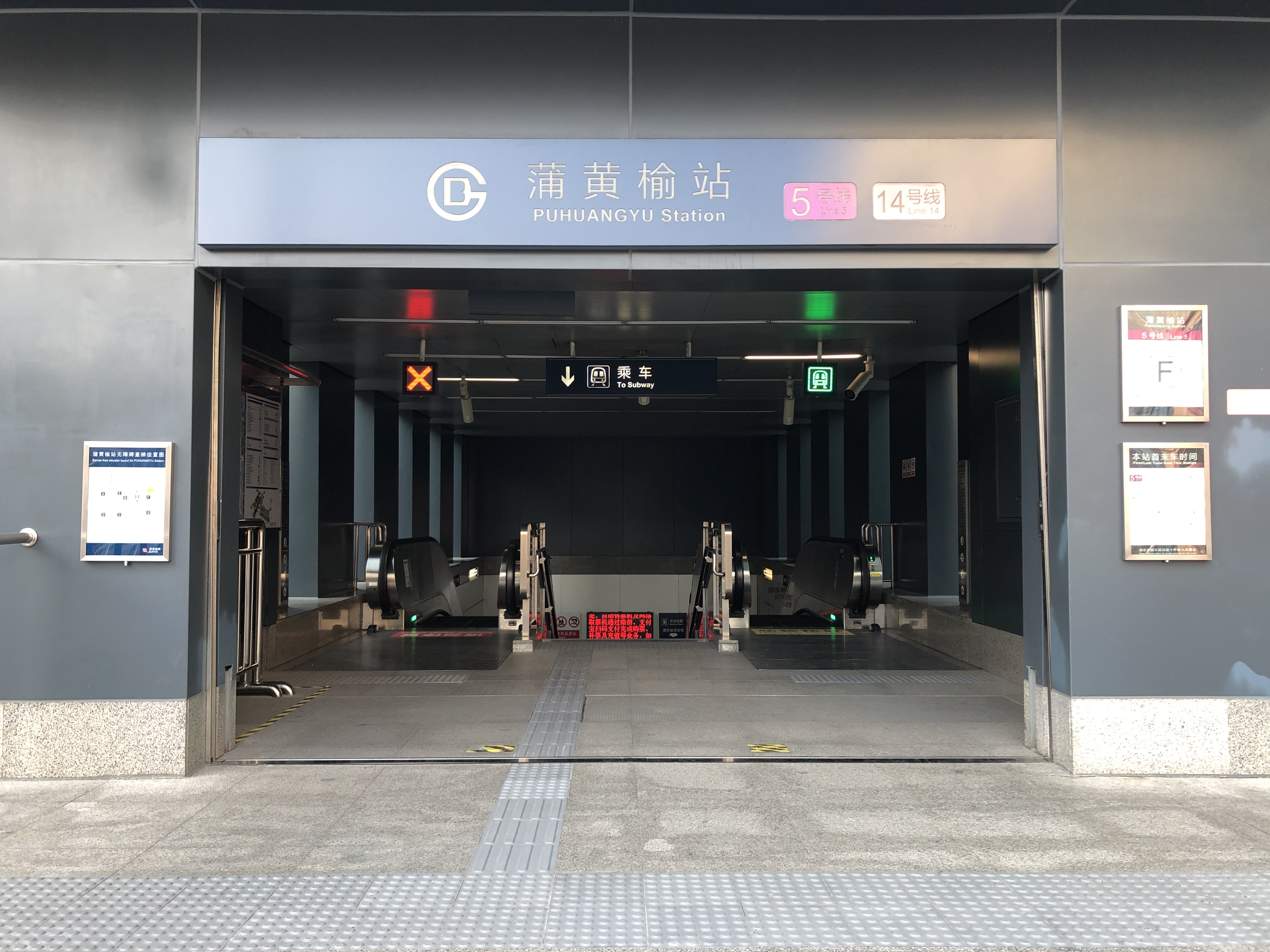 이 역은 푸팡로(蒲方路), 안러린로(安乐林路), 푸황위로(蒲黄榆路)의 교차로에 위치한다. 5호선 역은 푸황위로 바로 아래에, 14호선 역은 푸팡로 바로 아래에 있다.[4] “푸황위(蒲黄榆)”라는 지명은 1954년 팡좡 일대의 푸좡(蒲庄), 황투컹(黄土坑), 위수촌(榆树村)이 협동조합을 결성하면서, 북에서 남으로 3개 촌에서 한 글자씩 따온 푸황위 농업생산협동조합(蒲黄榆农业生产合作社)에서 유래하였다.[4][5] "푸황위" 명칭은 가오먀오촌(高庙村), 푸좡촌(蒲庄村), 난후퉁촌(南胡同村) 일대의 신규 단위주거촌에서 사용되면서 점차 지명으로 굳어졌다.[4][5]