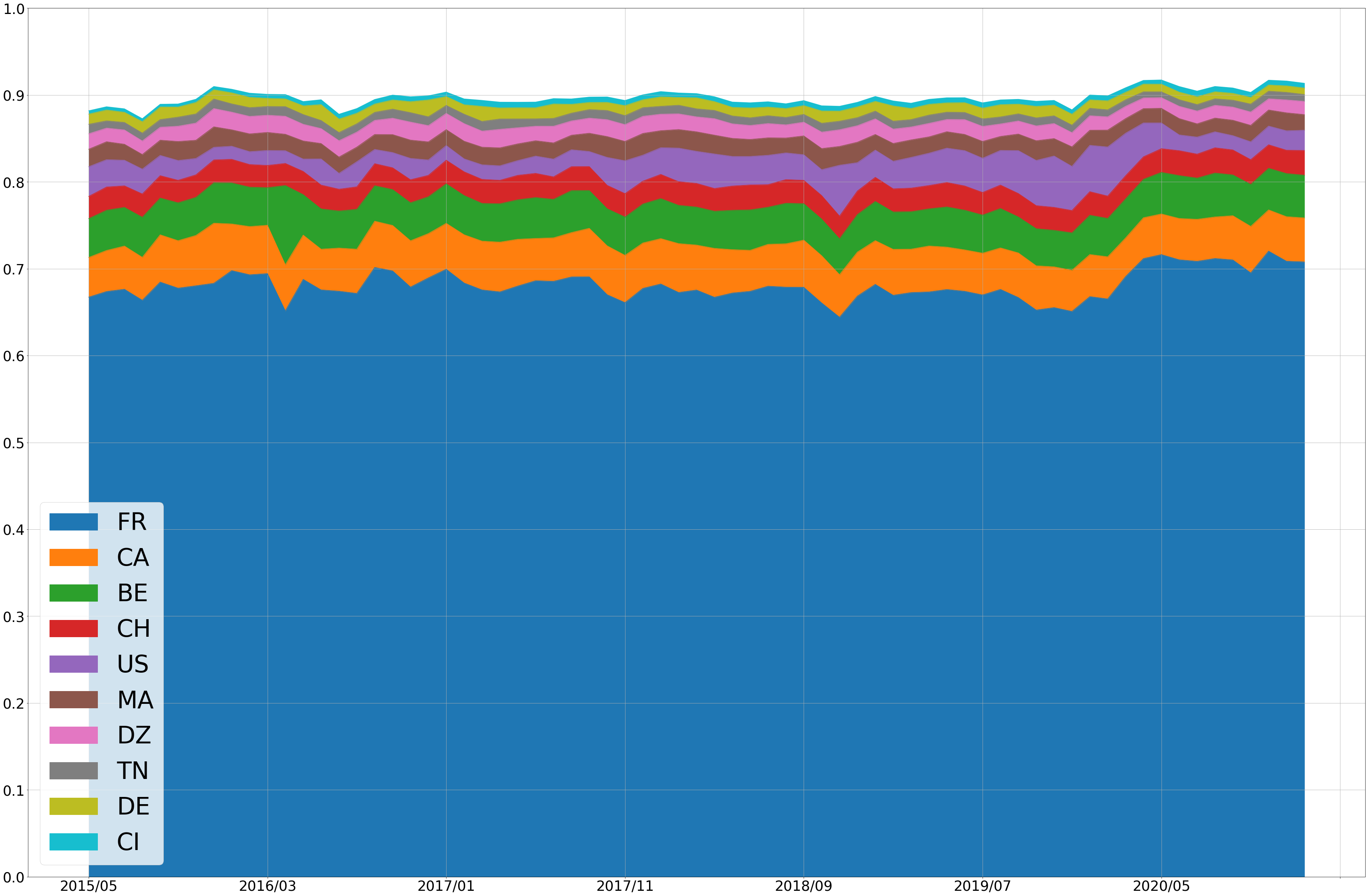 프랑스어판 위키백과는 주로 프랑스 사용자들이 참조하고 집필하지만, 위키백과의 다른 언어판과 마찬가지로 국제적이며 프랑스에만 국한되지 않는다. 특정 지리적 기사에서는 프랑스어 사용자가 많은 프랑스, 벨기에, 스위스, 룩셈부르크, 모나코와 같은 프랑스어 사용 지역에서 강점을 보인다. 또한, 이들 국가 외의 다른 프랑스어 사용 지역에서도 다른 언어판 위키백과에 비해 프랑스어판 위키백과에서 많은 집필이 이루어지고 있다. 거의 모든 프랑스어 사용 국가에서 프랑스어판 위키백과는 영어판 위키백과 다음으로 지리에 특화된 페이지를 보유하고 있다.[17]
