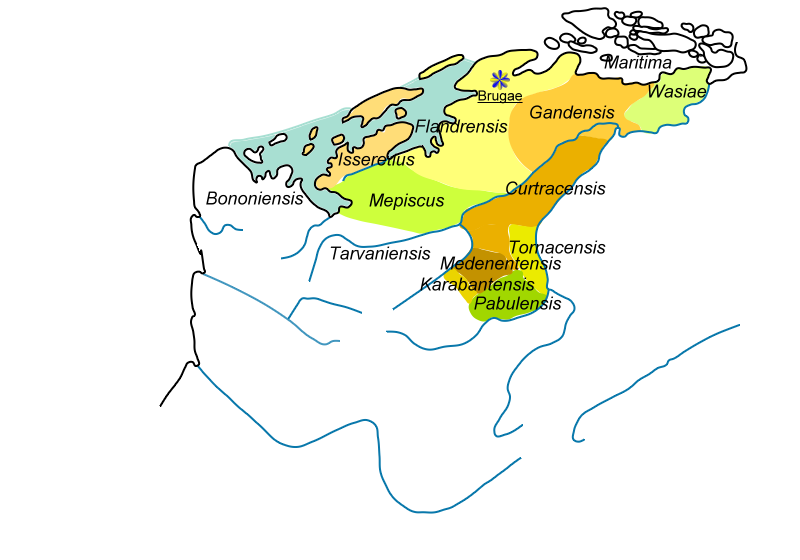 중세 초기4세기 이후, 색슨족과 프랑크족이 스헬트 지역에 다시 정착하여 게르만 문화와 언어를 유지했다. 5세기에는 살리안 프랑크족이 북부 프랑스와 왈로니아 지역에 정착했고, 6세기부터는 라인란트 출신 프랑크족과 다른 게르만 부족들이 북쪽 지역에 정착했다. 초기에는 기독교화가 더뎠으나, 베다스트와 투르네의 엘레우테리우스 등의 노력으로 아라스 주교구와 투르네 주교구가 재건되었다. 6세기 말에는 덴텔리누스 공국이 건설되어 프리지아족과 색슨족의 침입에 대한 군사적 방어 역할을 했다. 6세기 말과 7세기 말에는 파드칼레에서 새로운 게르만족 유입이 나타났고, "-inga haim" 형태의 새로운 정착지가 형성되었다. 7세기에는 종교, 군사, 행정 인프라 재건이 시작되었고, 8세기에는 이중 언어 지역이 나타났다. 8세기에는 다고베르트 1세의 지원 아래 생 베르탱 수도원, 생 바아스트 수도원 등 수도원 설립을 통한 새로운 기독교화 시도가 이루어졌다. 아만두스와 엘리지우스 등의 선교사들이 활동했으며, 엘리지우스는 "플랑드르"라는 단어를 처음 언급했다.[4] 7세기와 8세기에는 투르네 가우, 캉브레 가우, 타로 가우, 브라반트 가우, 로다닌 가우, 겐트 가우, 멤피스쿠스 가우, 플랑드르 가우, 오스터반트 가우, 쿠르트라크 가우 등 여러 가우(gaue) 또는 파지(pagi)가 만들어져 플랑드르 백국의 기초를 형성했다.[5]
