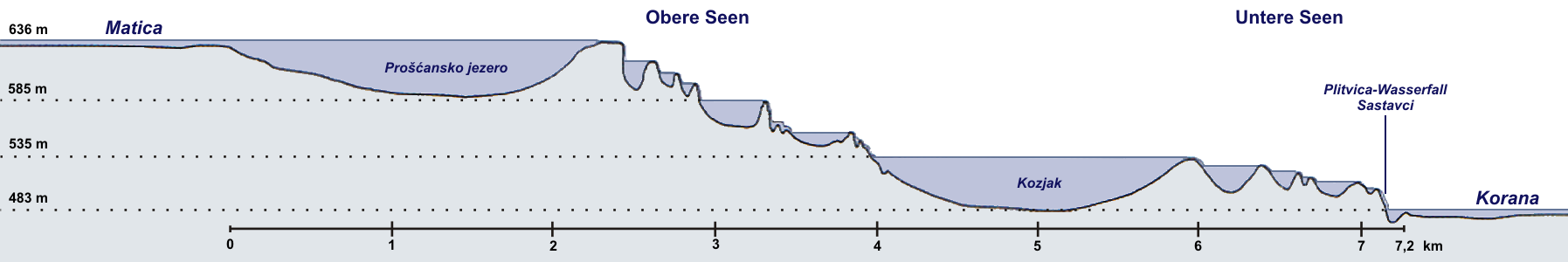 전체 면적은 296.85km2이며, 가장 큰 두 호수인 Proscansko jezero와 Kozjak이 약 80%를 차지한다. 두 호수는 면적이 넓을 뿐만 아니라 깊이도 각각 37m와 47m로 가장 깊다. Kozjak 호수에서는 친환경 전기 배가 운행 중이다. 다른 호수들의 깊이는 25m이며, 호수 간 지형적 높이 차는 약 133m이다.[61]