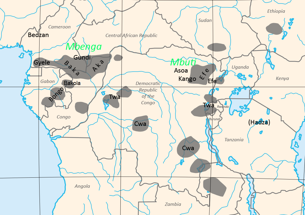 아프리카 피그미족들은 콩고 분지를 비롯한 아프리카 중부의 여러 지역에 살고 있다. 이들은 서로 관계가 없는 10여 개의 부족으로 이루어져 있다. 콩고 분지 서부의 음벵가족(아카족, 바카족)은 반투어군이나 우방기어군 언어를 사용한다. 콩고민주공화국 이투리 우림의 음부티족은 반투어 또는 중앙수단어군 언어를 사용하며, 아프리카 대호수 지대의 트와족은 반투어군의 루리어나 키가어를 사용한다.[10]
