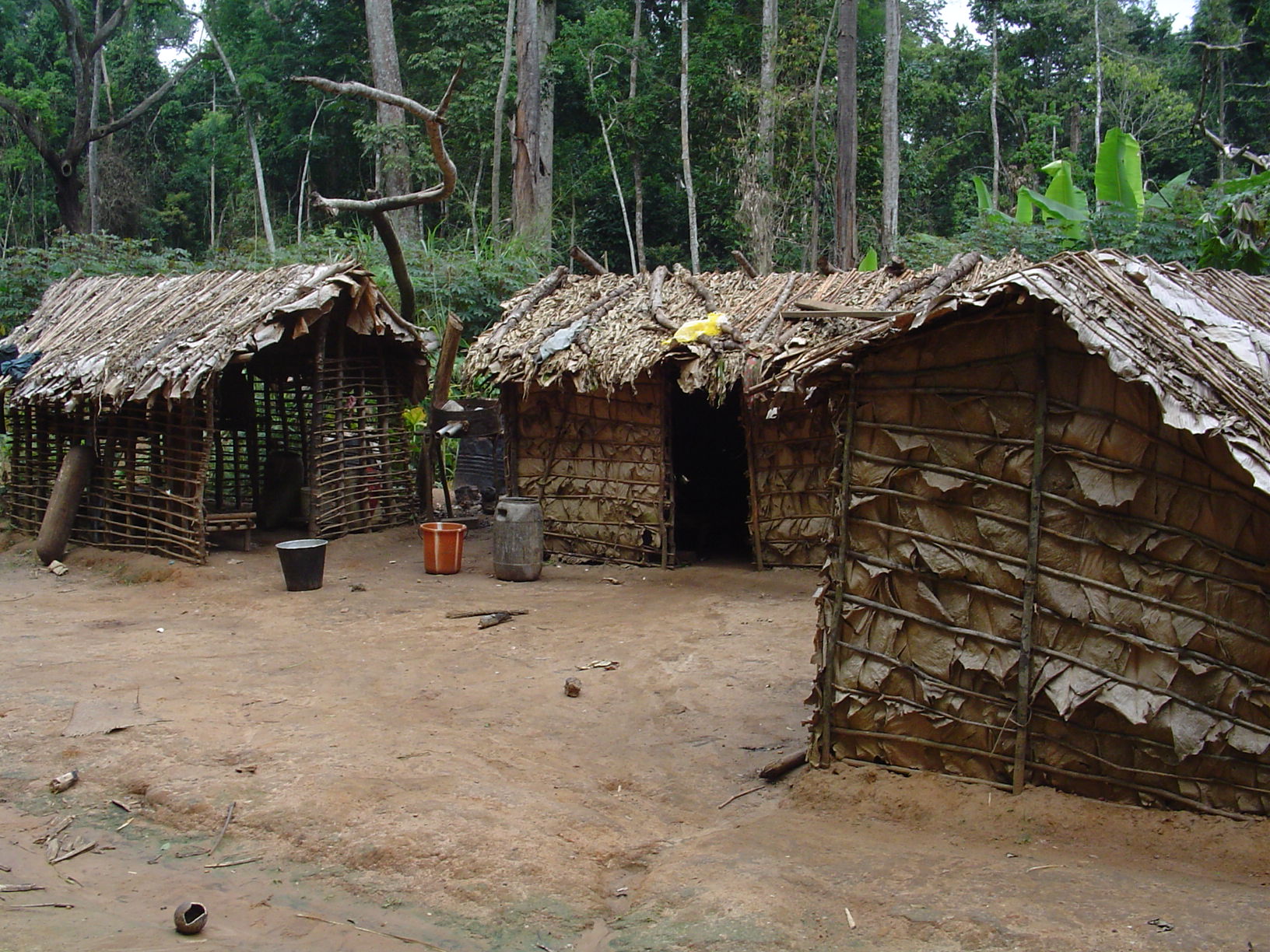 콩고 공화국의 상가 강 연안의 웨소(Ouesso)와 포콜라(:pl:Pokola) 중간 지점에 있는 피그미의 집은 나뭇가지와 잎으로 지어져 매우 좁으며, 나무 침대와 선반과 같은 기본적인 가구만 있다. 열대 우림에서는 밤에 추워지기 때문에 내부에는 화로가 설치되어 있고, 옥수수와 기타 과일을 증류하여 술을 만들기도 한다. 피그미족은 유능한 사냥꾼이기도 하다.