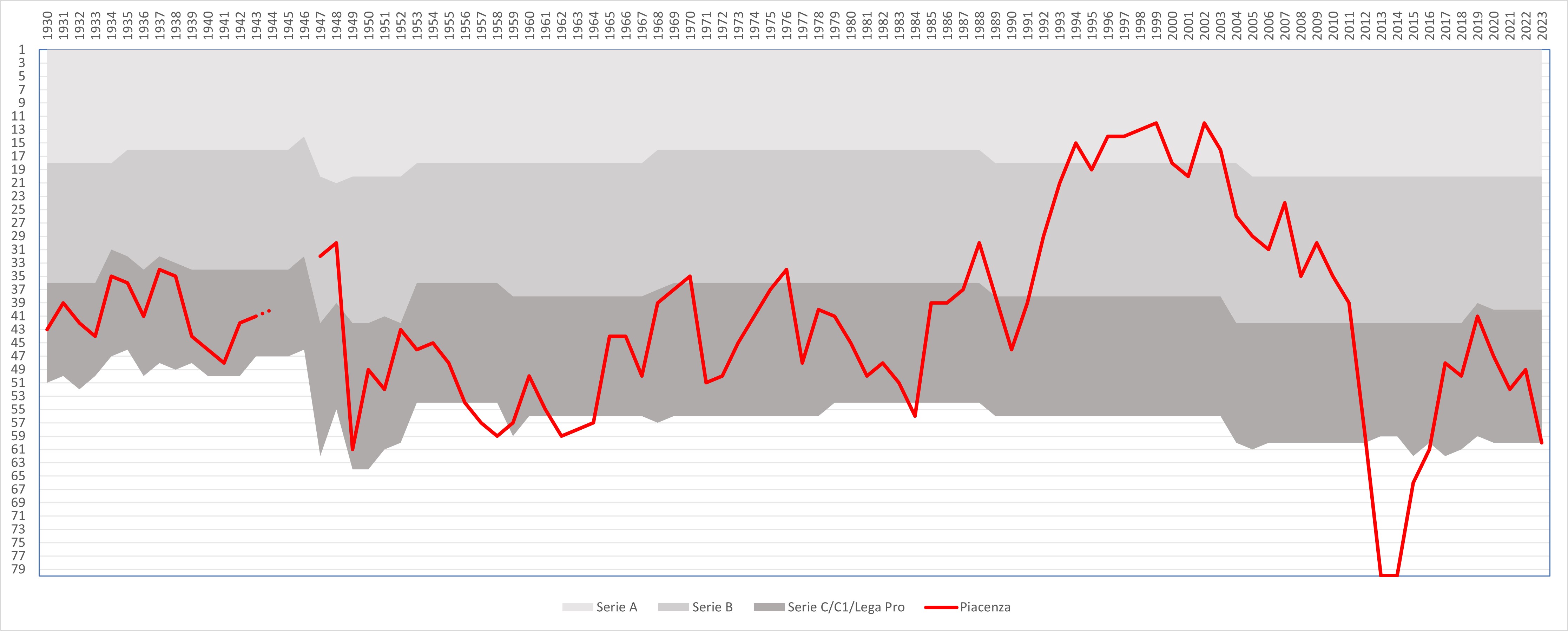 피아첸차의 이탈리아 축구 리그 구조 내에서의 성적 (1929/30 시즌부터 통합 세리에 A).