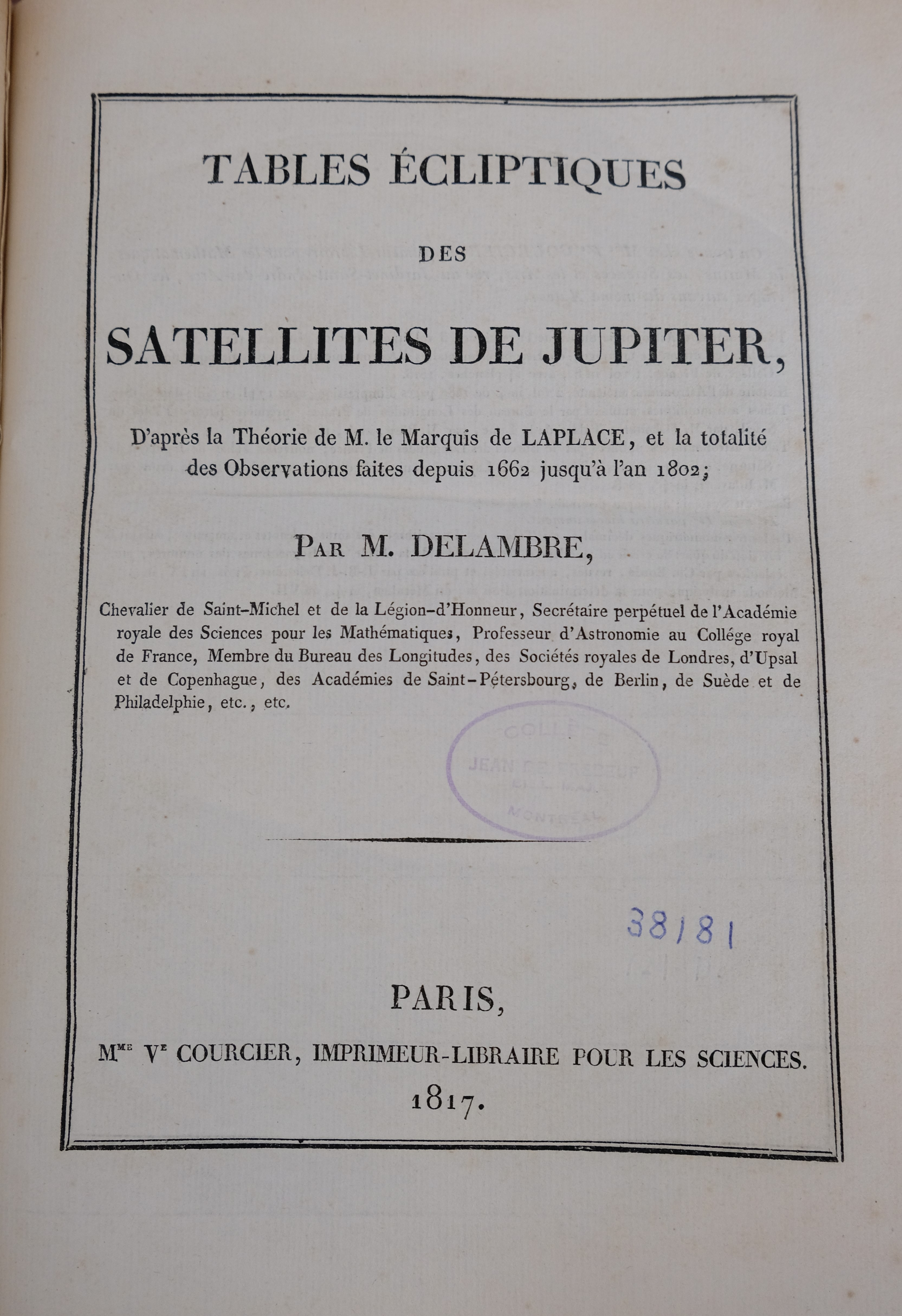 |left|thumb|248x248px|1817년 들랑브르의 "''목성의 위성의 식 테이블''" 복사본 표지. 이 표지에는 라플라스의 기여가 언급되어 있다.]]