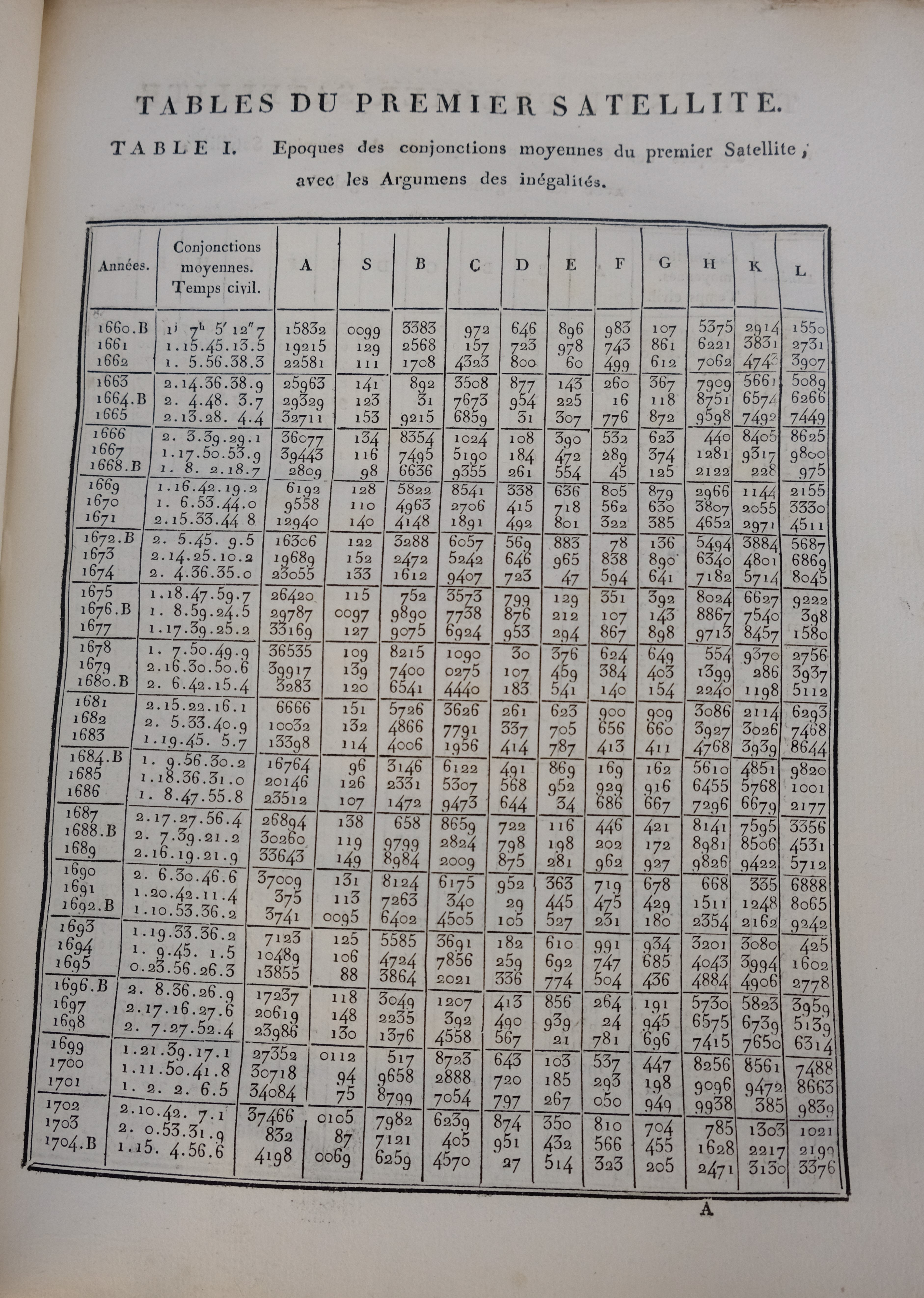 |thumb|253x253px|1817년 들랑브르의 "''목성의 위성의 식 테이블''"에 수록된 표 - 이 계산은 라플라스의 이전 발견의 영향을 받았다.]]