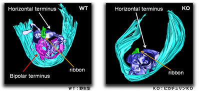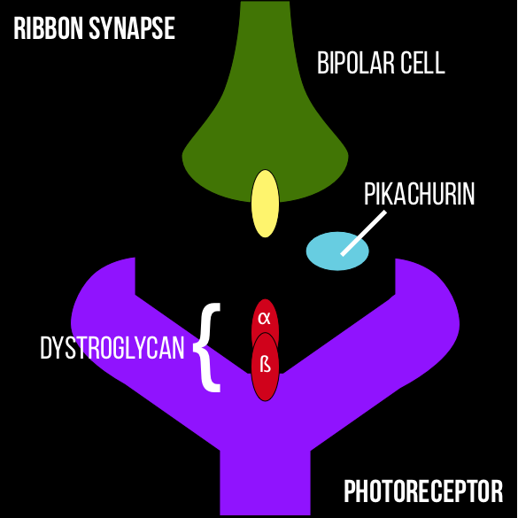 시냅스 형성은 포유류의 중추신경계가 올바르게 기능하는 데 중요하다. 망막 광수용체는 리본 시냅스라는 특수한 구조를 형성하는 축삭 말단에서 끝난다. 리본 시냅스는 광수용체 시냅스 말단과 망막의 외망상층(OPL)에 있는 양극성 세포 및 수평 세포 말단을 연결한다.[13] 피카츄린은 세포외기질과 유사한 망막 단백질로, 광수용체 리본 시냅스의 시냅스 틈에 위치한다.[16] 피카츄린이 부족하면 양극성 세포 수상돌기의 끝부분이 광수용체 리본 시냅스에 제대로 연결되지 않아 시냅스 신호 전달 및 시각 기능에 변화가 생긴다. 피카츄린의 기능은 아직 완전히 밝혀지지 않았지만, 정상적인 광수용체 리본 시냅스 형성과 시각적 지각의 생리적 기능에 중요한 역할을 한다는 것은 분명하다.[17]