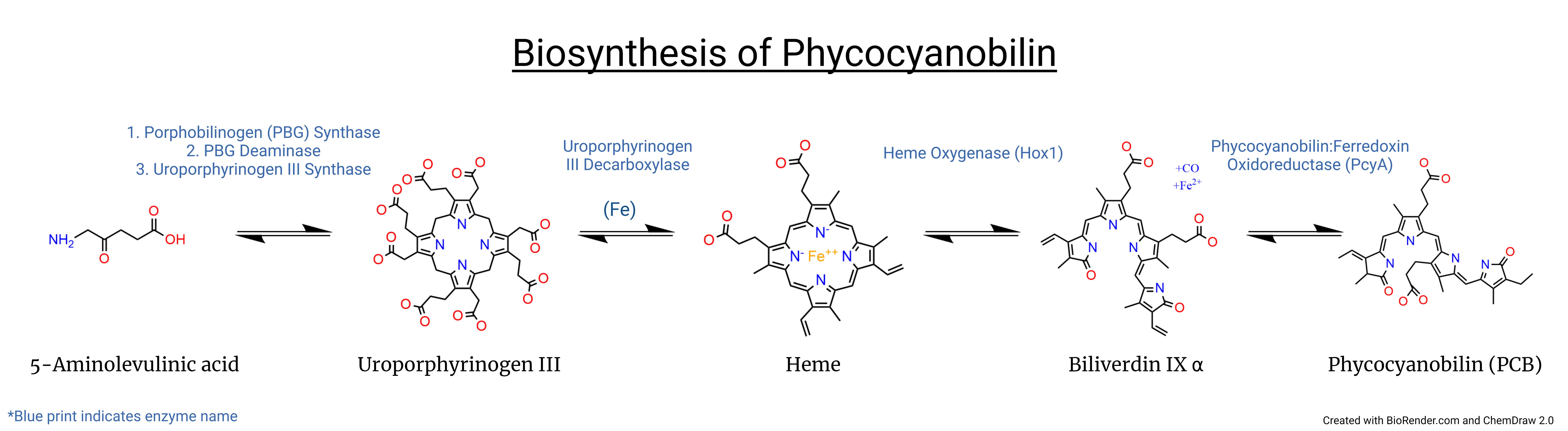 피코사이아노빌린은 5-아미노레불린산에서 시작하여 여러 단계를 거쳐 생합성되는 색소이다. 5-아미노레불린산은 포르포빌리노젠으로 전환된 후, 선형 테트라피롤, 유로포르피리노젠 III, 헴, 빌리베르딘 IX α를 거쳐 피코사이아노빌린으로 최종 환원된다. 피코사이아노빌린은 광합성, 건강기능식품 및 천연 색소로 활용된다.