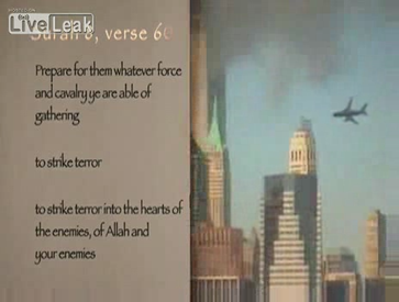 - '''알 안팔''' 60절: "그들을 위해 당신이 모을 수 있는 모든 힘과 기병을 준비하여, 알라와 당신의 적들의 마음에 공포를 주어라." 이 구절은 9.11 테러와 마드리드 열차 폭탄 테러 영상과 함께 제시된다.[34] 이맘 아부 함자 알-마스리는 "알라는 비무슬림이 죽을 때 기뻐하신다"고 말한다.[34] 2005년 7월 7일 런던 폭탄 테러에서 폭발한 버스와 지하철의 사진도 보여진다.[34]