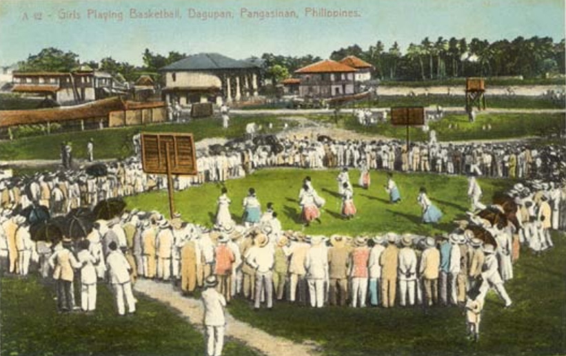 1910년 엽서에 묘사된 필리핀 여성들의 다구판 농구 경기 모습.