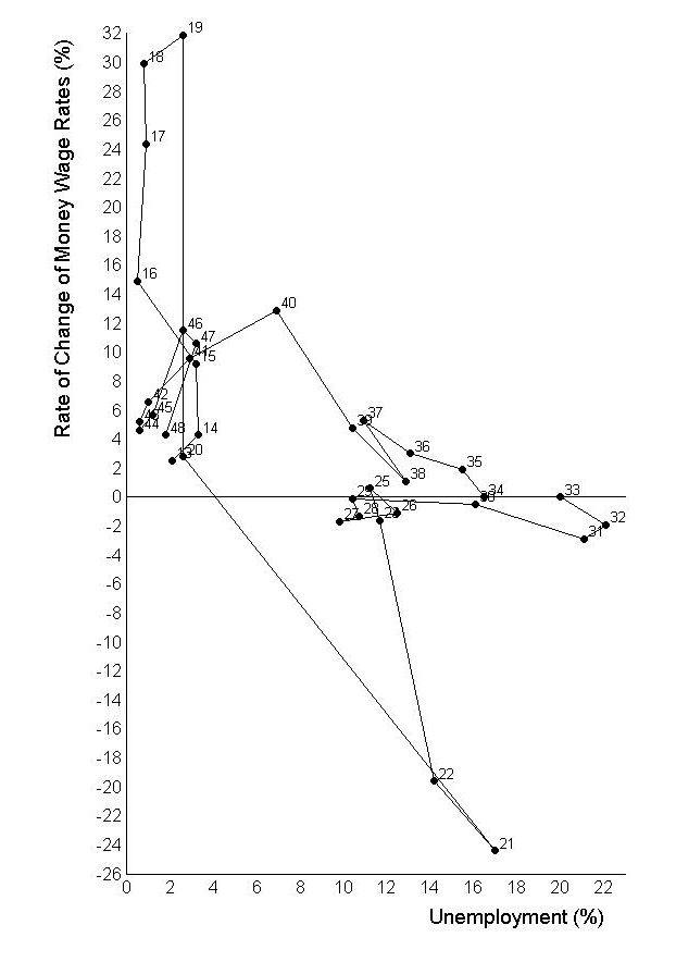 올번 윌리엄 필립스는 1958년 영국의 경제학술지인 ''Economica''에 발표한 논문에서 1861년에서 1957년 사이 영국의 자료를 분석한 결과 명목임금상승률과 실업률 간에 역(-)의 상관관계가 있음을 발견하였다.[43] 즉 실업률이 낮은 해에는 임금상승률이 높고, 실업률이 높은 해에는 임금상승률이 낮다는 사실을 밝혔다.