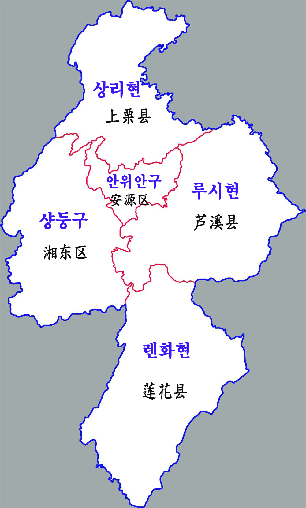 1970년 3월 10일 장시성 이춘 전구 핑샹시가 지급시인 '''핑샹시'''로 승격되었고,[16] 1976년 2월 21일 '''안위안 구''', '''샹둥 구''', '''상리 현''', '''루시 현'''이 설치되었다.[16] 1992년 6월 20일 지안 지구 '''롄화 현'''을 편입하였고,[16] 1993년 5월 12일 성관 구가 '''안위안 구'''로 개칭되었다.[16] 1997년 11월 13일 상리 구와 루시 구가 각각 현으로 승격하여 '''상리 현'''과 '''루시 현'''이 되었다.[16]