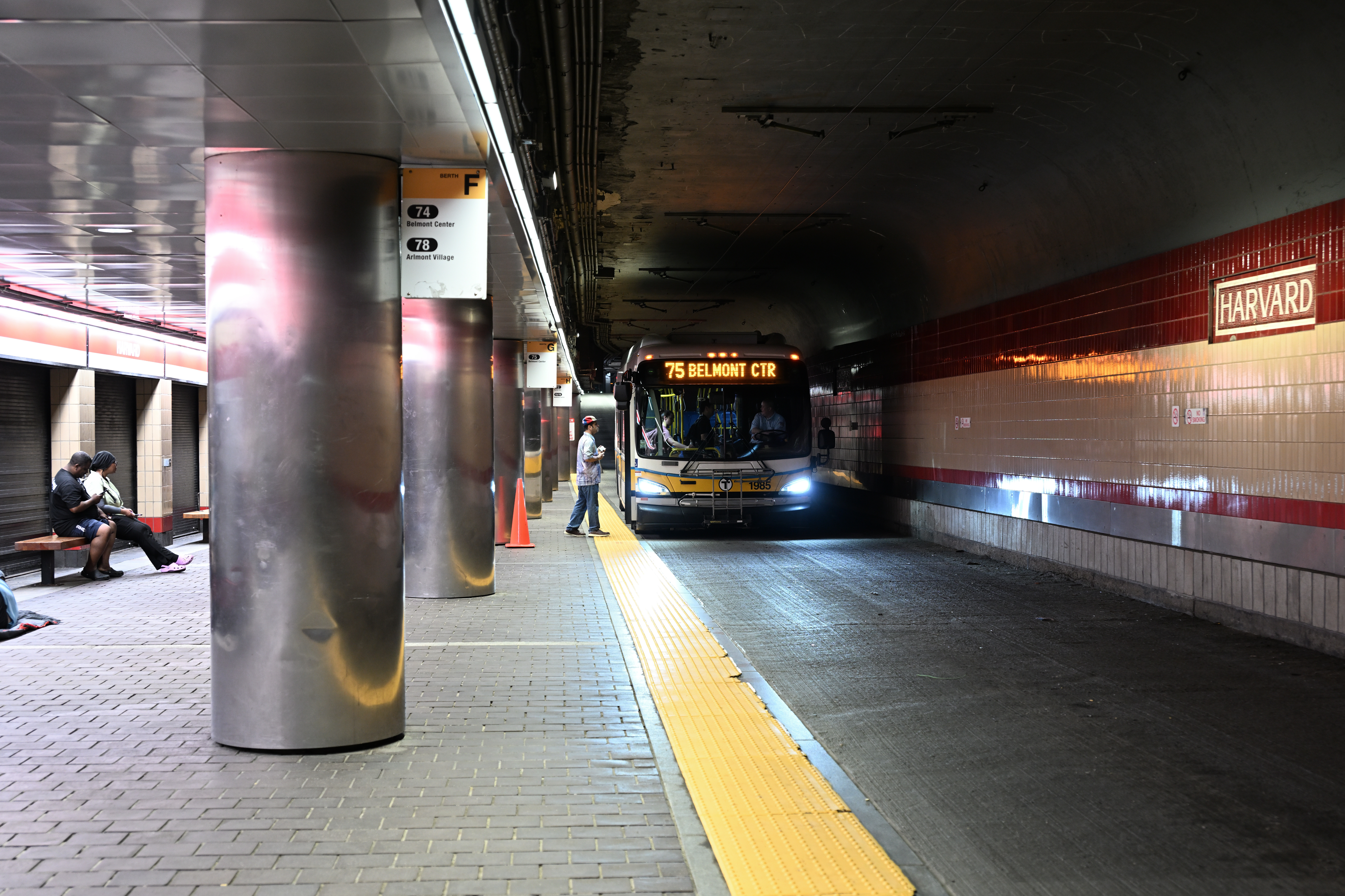 하버드 버스 터널에서는 여러 MBTA 버스 노선이 운행된다. 워터타운 광장 방면 71번, 허런 애비뉴 방면 72번, 와벌리 광장 방면 73번, 벨몬트 센터 방면 74, 75번, 알링턴 하이츠 방면 77번, 노스케임브리지 방면 77A번, 알몬트 마을 방면 78번, 설리번 스퀘어 역과 리저뷰어(클리블랜드 서클) 방면 86번, 메드퍼드 스퀘어 방면 96번 버스가 터널 내에서 승객을 태운다. 71, 73번 버스는 일요일을 제외하고 하부층에서, 나머지는 상부층에서 승하차한다.