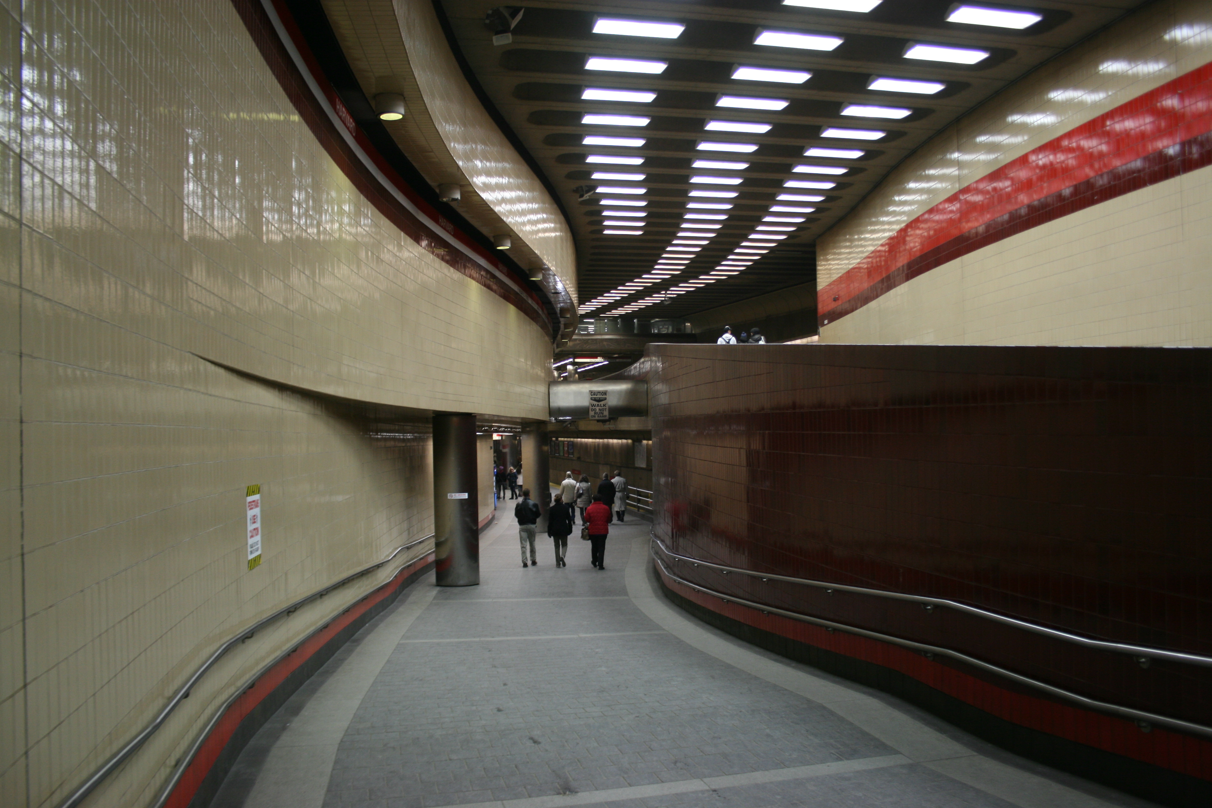 지하철 터널이 매사추세츠 애비뉴를 따라가도록 엄격히 제한되었기 때문에, 하버드 스퀘어에서 모든 레드 라인 열차는 하버드 스퀘어의 90도에 가까운 급곡선 부분에서 바퀴와 궤도 간의 큰 소음과 함께 저속으로 운행해야 한다. 급곡선 부분은 역 승강장의 내행 끝에 바로 있다.