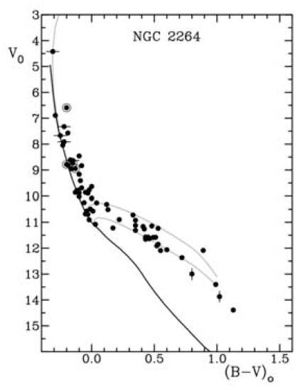 위쪽 그림에서 등시선은 특정 연령의 별들이 위치할 것으로 예상되는 곡선으로, 모든 별이 하야시 경로를 따라 진화한다고 가정하여 생성된다. NGC 2264의 별들 대부분은 이미 주계열(검은 선)에 있지만, 상당수 별들이 320만 년과 500만 년 사이 등시선 사이에 위치한다. 이는 별무리가 320만~500만 년 되었고, 많은 T Tauri 별들이 아직 하야시 경로에 있음을 의미한다. 비슷한 결과가 NGC 6530, IC 5146, NGC 6611에서도 나타났다.[3]