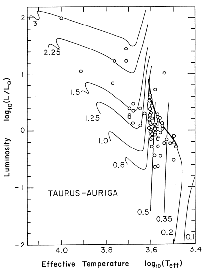 아래쪽 그림은 다양한 질량에 대한 하야시 경로를 여러 출처에서 수집된 T Tauri 관측 데이터와 함께 보여준다. 오른쪽의 굵은 곡선, 즉 별 탄생선에 주목하라. 이론적으로 일부 하야시 경로는 탄생선 위로 확장되지만, 그 위에 있는 별은 거의 없다. 실제로 별들은 각자의 하야시 경로를 따라 아래로 진화하기 전에 탄생선에 "태어난다".