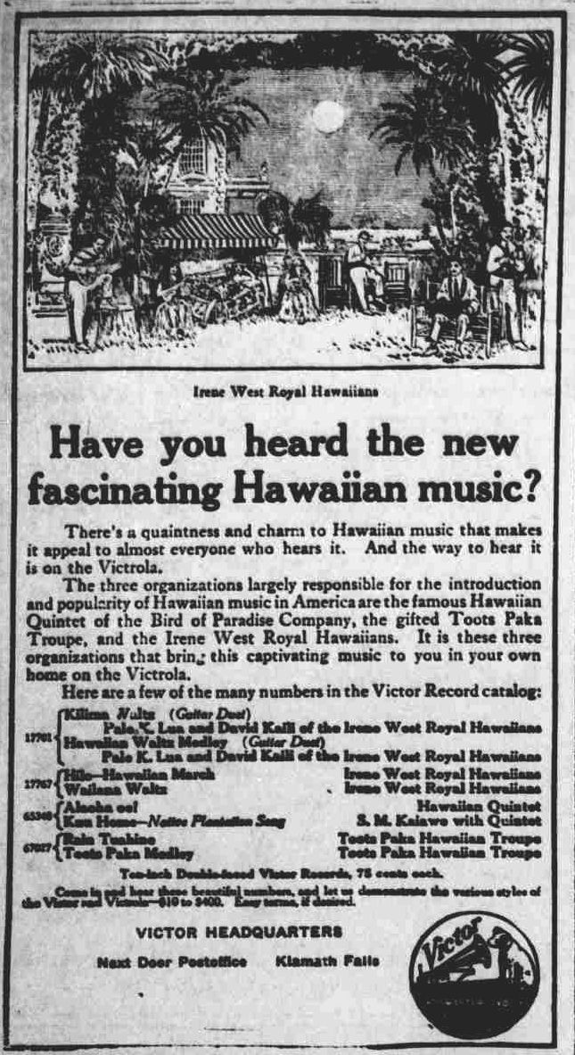 1920년대와 30년대에 하와이 음악은 현지 관광의 필수적인 부분이 되었으며, 대부분의 호텔과 관광지는 어떤 형태로든 음악을 통합했다. 가장 초기이자 가장 인기 있는 음악 공연 중 하나는 코닥이 후원한 ''코닥 훌라 쇼(Kodak Hula Show)''였는데, 관광객들은 코닥 필름을 구입하여 무용수와 음악가들의 사진을 찍었다.[1] 이 쇼는 1937년부터 2002년까지 진행되었다. 와이키키 레코드(Waikiki Records)는 코닥 훌라 쇼의 음악을 담은 여러 장의 바이닐 LP를 풀 컬러 사진과 함께 발매했다.[22]