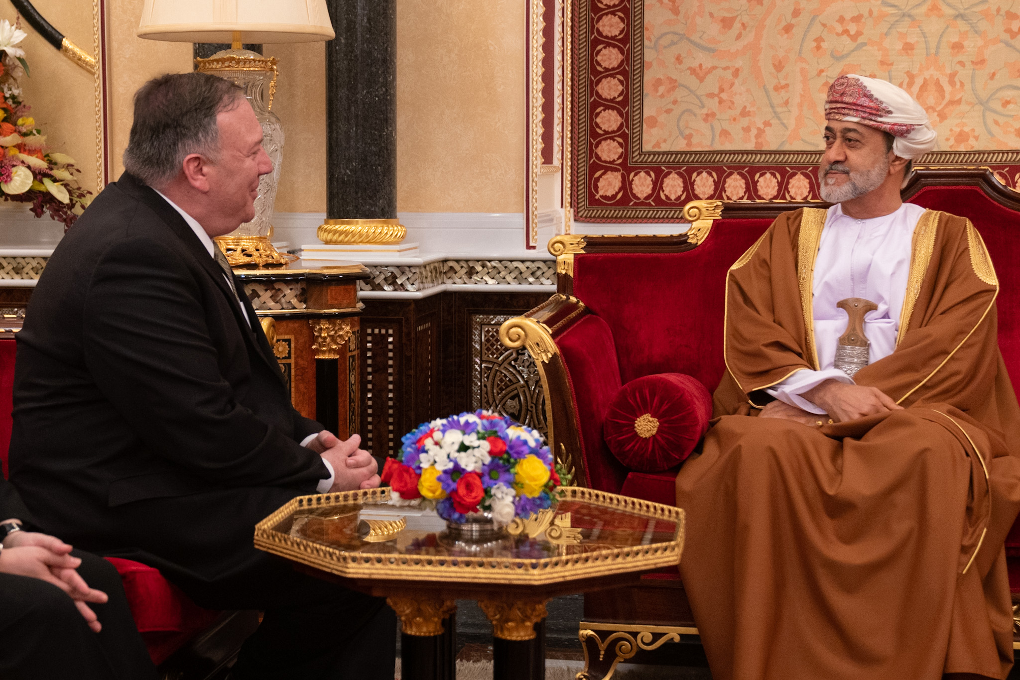 2020년 2월 무스카트에서 미국의 국무장관 마이크 폼페이오와 만나는 하이탐 빈 타리크(오른쪽)