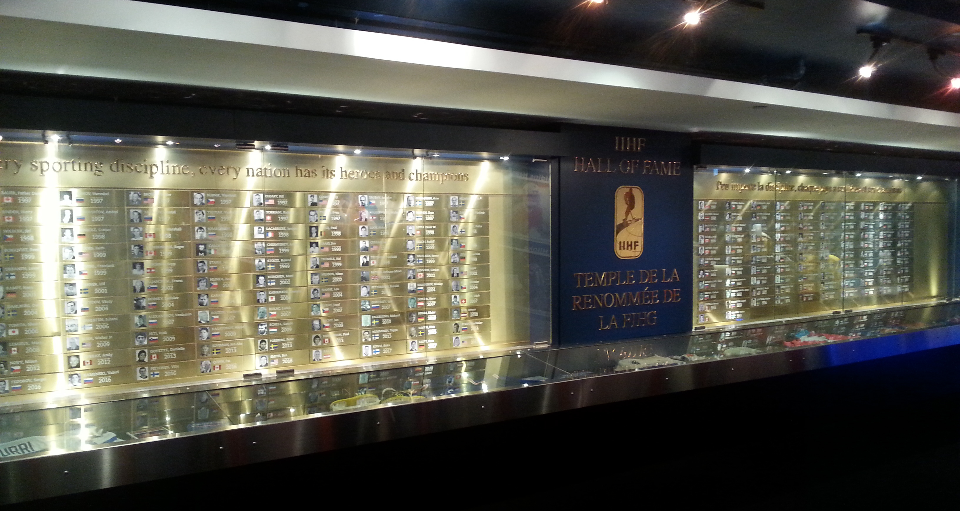 명예의 전당 전시물 중 상당수는 NHL에 할애되어 있지만, 북미 지역 외부의 하키 리그와 선수들을 위한 전시 공간도 마련되어 있다. 1998년 6월 29일, 약 557.42m2 규모의 "세계 하키 존"이 개장하여 국제 아이스하키 연맹(IIHF) 회원국들의 프로필과 국제 대회 관련 전시물을 전시하고 있다.[4][30][31][32]4. 4. 1. IIHF 명예의 전당