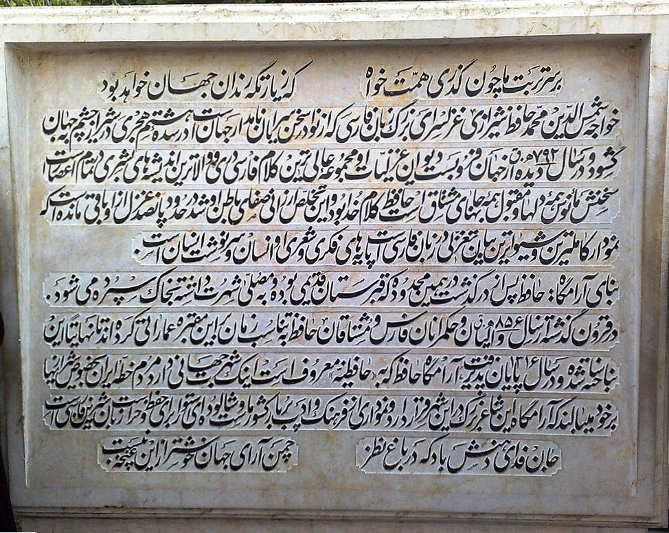카림 칸 통치 시기인 1773년, 훨씬 더 실질적인 기념관이 정원에 건설되었다. 무살라 정원의 계절성 루드카네예 코슈크 강 북쪽에 위치한 하페지에(Hāfezieh)는 중앙 기둥 4개로 구성되었으며, 동쪽과 서쪽 끝에 2개의 방이 건설되었고 북쪽과 남쪽 면은 열려 있었다. 이 건물은 정원을 두 구역으로 나누어 앞쪽에는 오렌지 숲이, 뒤쪽에는 묘지가 있었다. 실제 무덤은 구조물 외부에, 묘지 중앙에 있었으며, 대리석 석판이 무덤 위에 놓였다. 대리석에는 서예가에 의해 하페즈의 시 발췌문이 새겨졌다.2. 3. 근대 시기의 논란과 재건