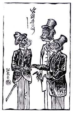 1883년 10월 30일, 대한민국 최초의 신문인 한성순보가 발행되었고, 이후 다른 신문들이 뒤따랐다. 이 신문들에는 기사를 해설하는 삽화가 실렸지만, 만화는 게재되지 않았다. 1909년 6월 2일에 발행된 대한민보 지상에 처음으로 "삽화"가 등장했다. 서울 출신의 화가 이도영|李道榮한국어(1884년-1933년 또는 1885년-1934년)의 "삽화"는 주로 당시 한국 지식인에 대한 풍자와 민중 계몽을 주제로 한 목판화였다. "남의 숭내"라는 작품에서는 서양 문화를 겉모습만 모방하는 당시 지식인의 모습이 프록코트 차림의 원숭이로 희화화되었다. 1910년의 한일 병합으로 대한민보는 폐간되었고, 이도영의 "삽화"는 1년 만에 종료되었지만, 신문 등에서는 이 희화가 '100년 이상의 역사를 가진 한국 만화의 첫 작품'으로 소개되고 있다.[70][71]